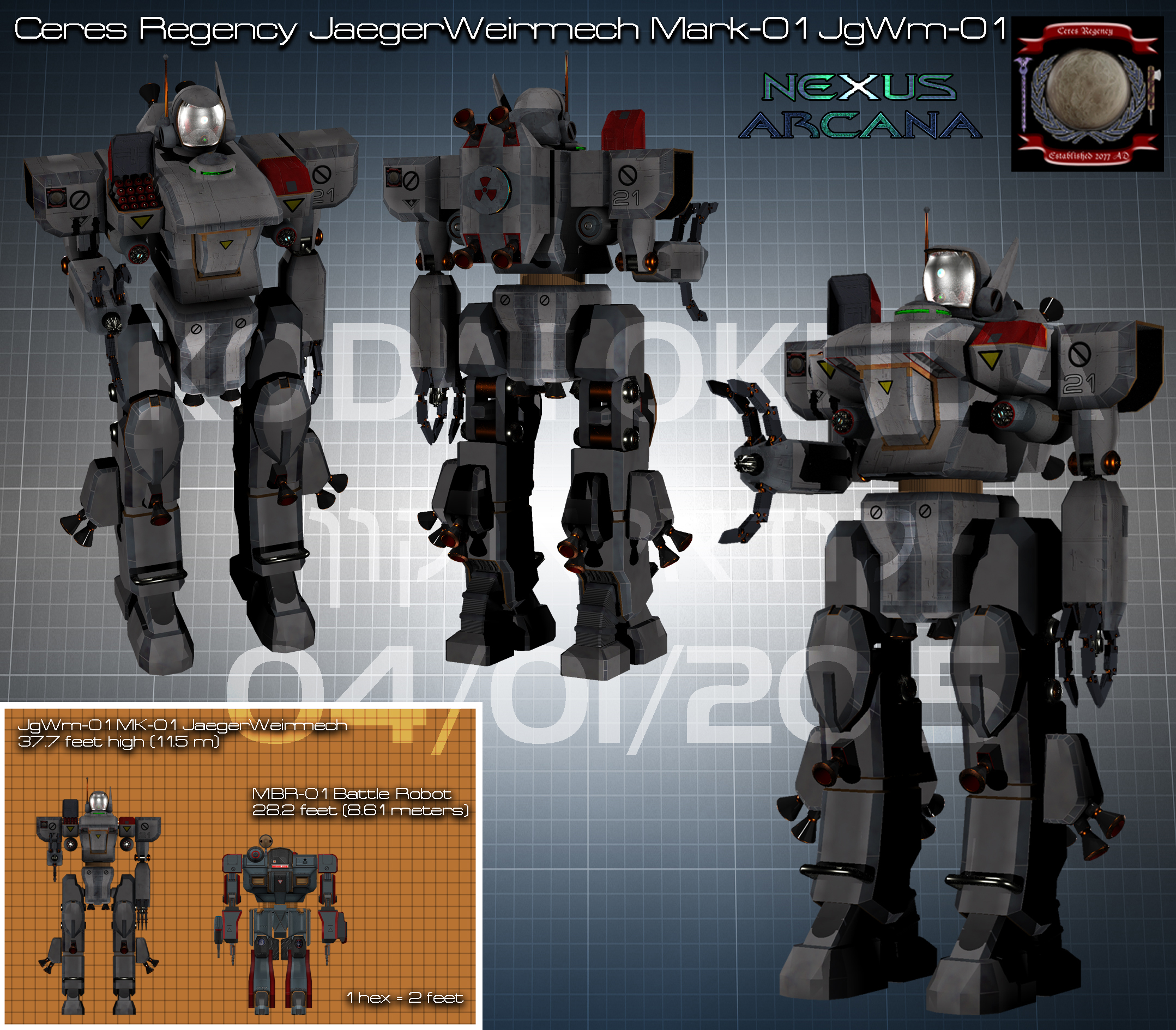 The JgWM-02 JägerWeirMech was the brainchild of Doctor Xiang and a group of secret joint USSN/UN revolutionary task force members that were established in the early 2160s. The USSN team provided Dr. Xiang with detailed blueprints and technical readouts of the EFR MBR-01 main battler robot produced during the 2160s and some of the proposed upgrades that had been put forth for the MBR-01A model due to be produced in 2171 AD. The leaders of the conspiracy against the Solar Empire wanted a machine that could overcome this new mecha and allow Ceres to become the dominant force in the Sol System by the end of the 2170s. Thus, the JgWM-02 JägerWeirMech was developed.