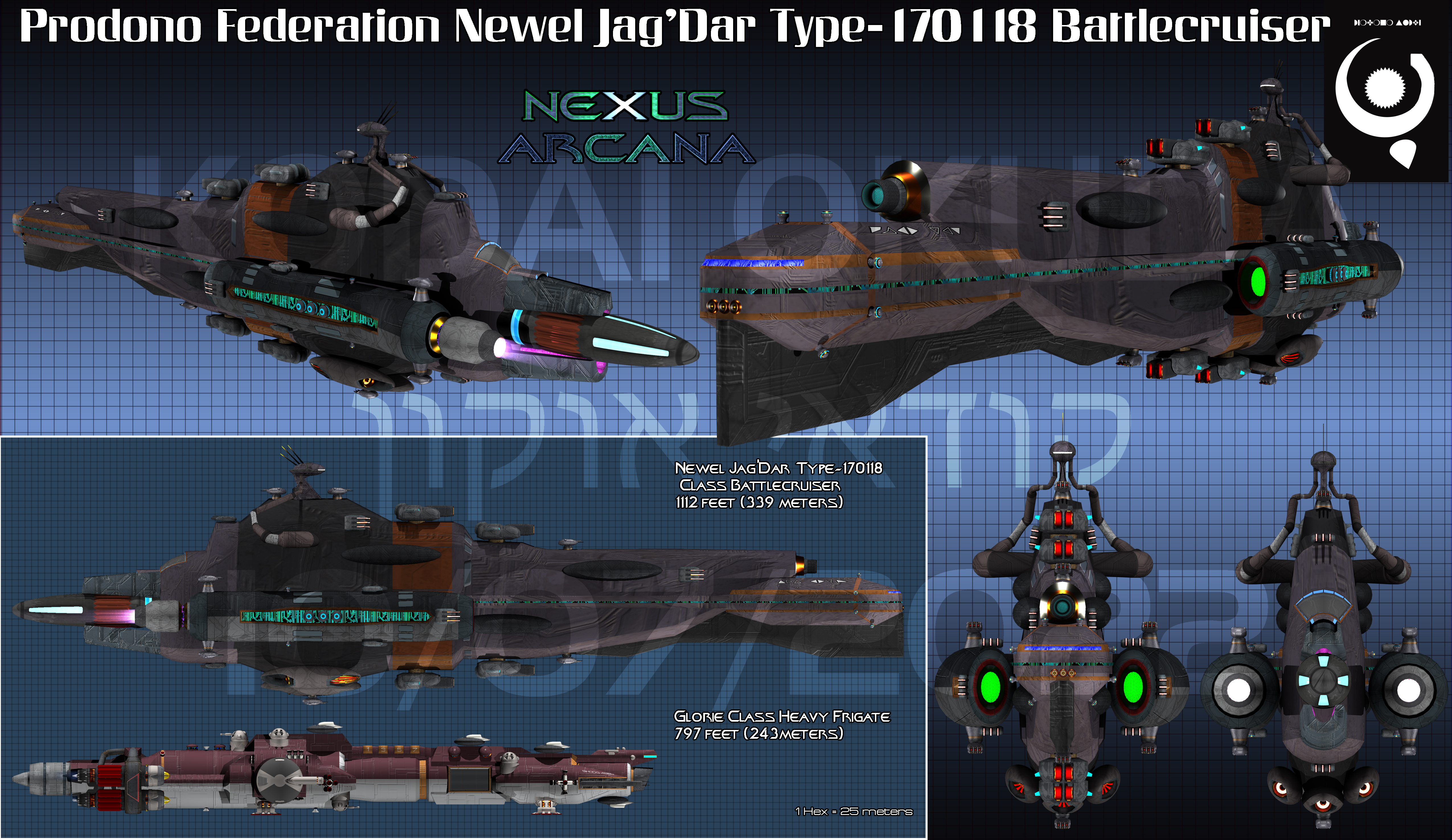 Almost nothing is known about the bulk of the Prodono Alliance fleet that was upgraded to Federation standards. Therefore, next to nothing is known about the Newel Jag'Dar Type-170118 other than it is the refit of the an ancient Prodono Alliance Dreadnought that was built sometime during the 350,000s BC. The Newel Jag'Dar Type-170118 was essentially brought up to the standards of the Newel Kat'Var Type-170169 Main Space Battleship, but was reduced in naval rank to a Battlecruiser.