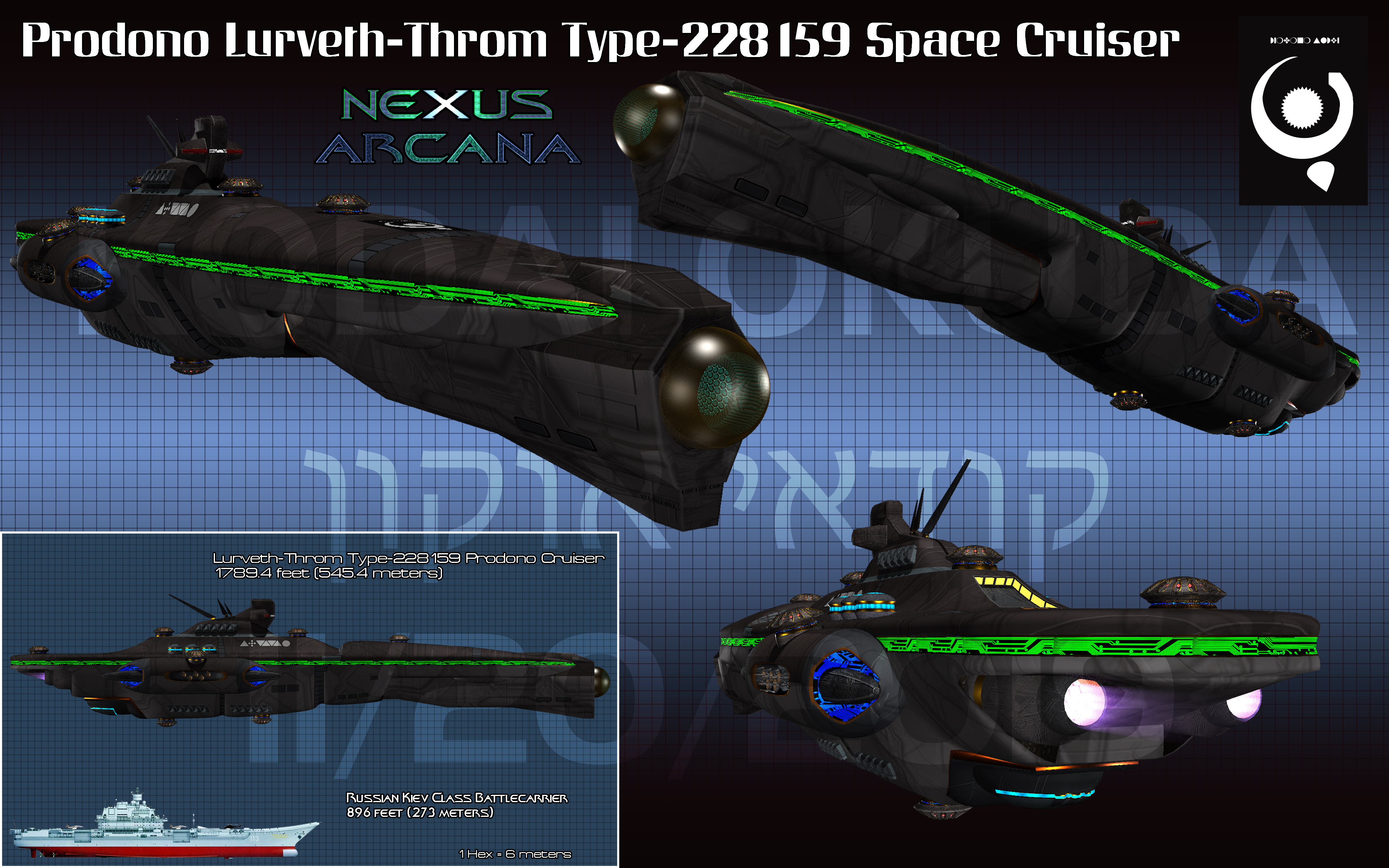 Like most of the data on the Prodono Imperial spacecraft, very little to nothing is know about the Prodono Empire or the history of the Lurveth Throm Type-228159 outside of the capabilities, weapons, armor, and systems of the ships encountered during the Outer Sphere War that were used by Dr. Donaldson's Special Operations Group. Of particular note with regard to this variant of the Lurveth Throm are its rotary MASER cannon turrets. These turrets were a shock to even Donaldson's forces due to the fact of just how powerful they are. They are variable-power and so can be reduced to 10% total power output (reducing damage and range to just 10% of full) which allowed the rotary turret to fire ten-times as many blasts and hit mecha-sized targets. At full power, the rate is normal, but the beams are not capable of locking onto small, fast, mecha due to the beam-creation-time (about 2 seconds) for each beam. That small two-second delay allows small, mecha-sized craft, the ability to change course and dodge the beams easily.