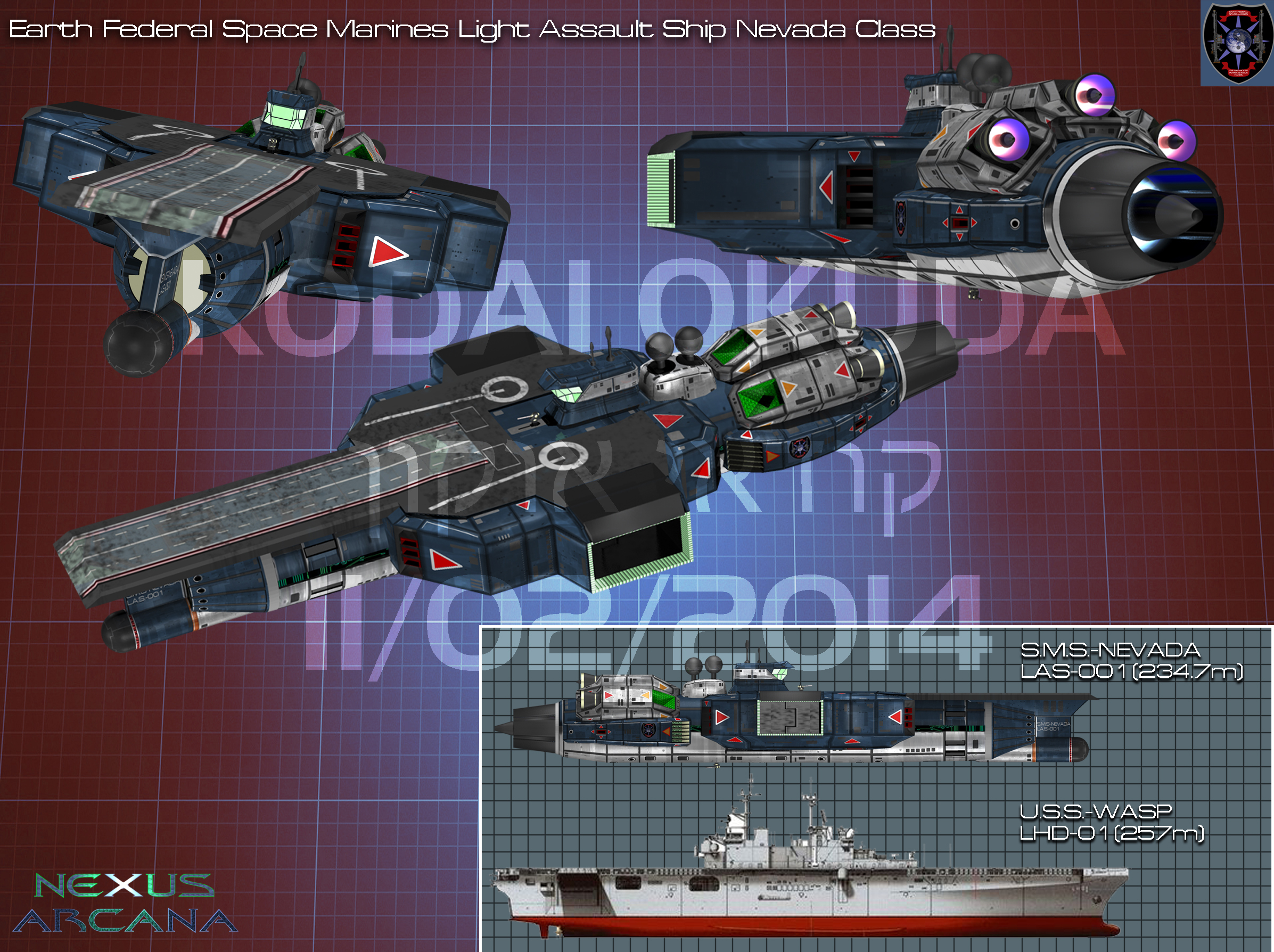 The Nevada class ushered in an entirely new era of space travel for the Earth Federal Space Marine forces during the 1st Interplanetary War. This new class was the first true interplanetary warship built intentionally as a planetary assault ship. The EFSM designated the craft “LAS” or Light Assault Ship due mostly to its small size compared to the other assault ships planned by General Walsh's team after the Battle of Pallas. The Nevada class was loosely based on the hull frame of the Arctic class destroyer-escorts that were used up until the 1st Battle of Pallas in 2173 AD by the EFSM. These craft were initially conceived of as Protean fighter carriers, but the commander-in-chief of the EFF at the time, General Walsh, decided against the mass production and deployment of the PF-01 due to secrecy and security concerns.