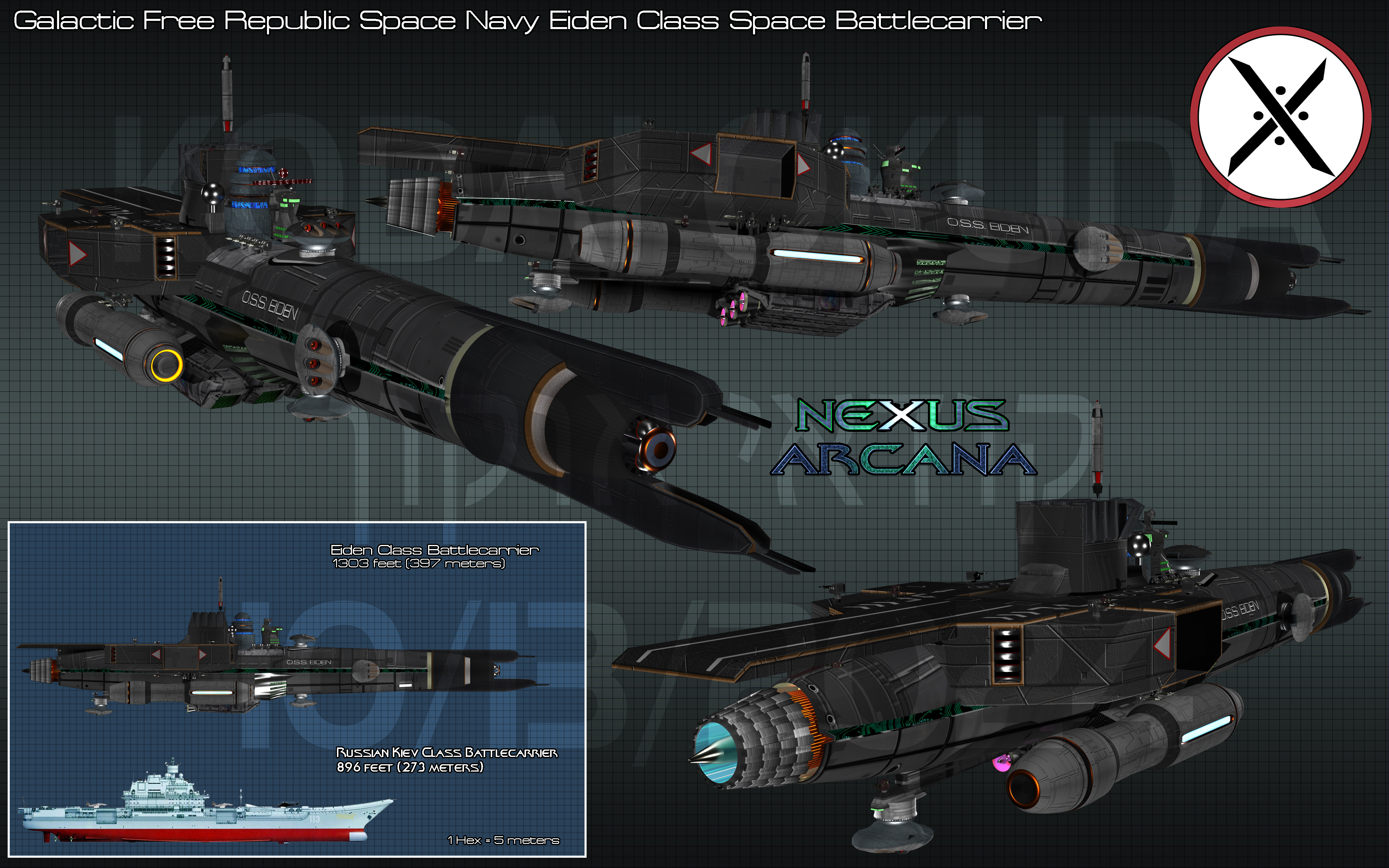 The Eiden class was an upgrade of the ailing Furious class of battlecarrier. It was the last of the 1st generation of battlecarriers still in service with the Orion forces. Originally commissioned as the Warspite class of battlecarrier during the 1st Interplanetary War in 2174, the Eiden class was the fourth incarnation of this family of warships making the design nineteen years old. The only significant difference between the Furious class and the Eiden class were the faster than light drives. These new drives--a pair of Prodono Technologies D'Rhell-Feul DF-2193-1500 (1st Generation) Super Luminal Velocity Drives--were built using the Prodono Goro Dei factory at Chi Orionis and were an improved version of the Prodono Alliance type SLV drives used by Central Control's Prodono Android forces. These new SLV drives had a considerably faster space-time dilation of the Stellar Warp Drives of the Furious class. This gave the Eiden a comparible space-time dilation warp speed to that of the Prodono Alliance type warships.
