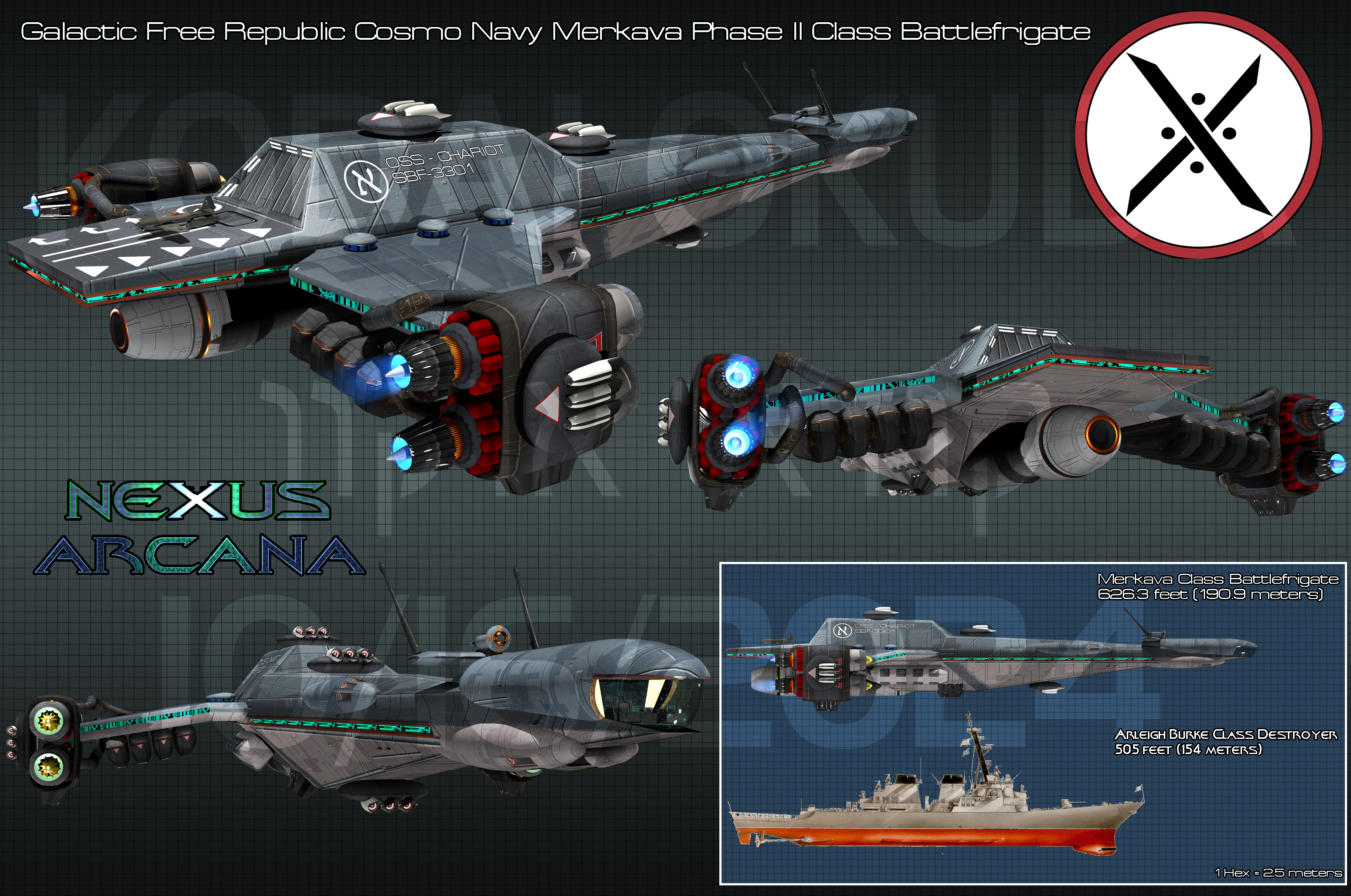 The Merkava class Mark-IV (Phase II) was the successor to the Merkava Mark-III (a refit Prodono Vlor Benai class ship using Varna based technology) and the first model to be mass produced by the Galactic Free Republic space navy. Whereas the previous classes (including prototypes) were a combination of new--Terran-based, Prodono, and Varna derived--weapon systems intended to defeat energy resistant armor and plasma-shielding, the Mark-IV was more heavily Prodono tech in order to allow it to be produced at the Goro Dei of the Chi Orionis star system. The Mark-IV was essentially the same vessel as the Mark-III only with a redesigned Prodono Alliance D'Rhell-Feul DF-155100-500A Super Luminal Velocity Drive and the Prodono Alliance K'Tellar Ubrich KTU-Type-170055A Level-2 omnidirectional Plasma-Type deflector field generators. This made the Mark-IV more powerful than the Prodono Android O'Mahu Thu Type-148914 space destroyer. Naturally the Mark-IV became a favorite of the Prodono Androids in addition to the backbone of the Orion Theocratic Republic Cosmo Navy of the early 23rd Century. Eventurally these ships had mixed crews of both Prodono Android and Methusians of the Orion Theocratic Republic.
