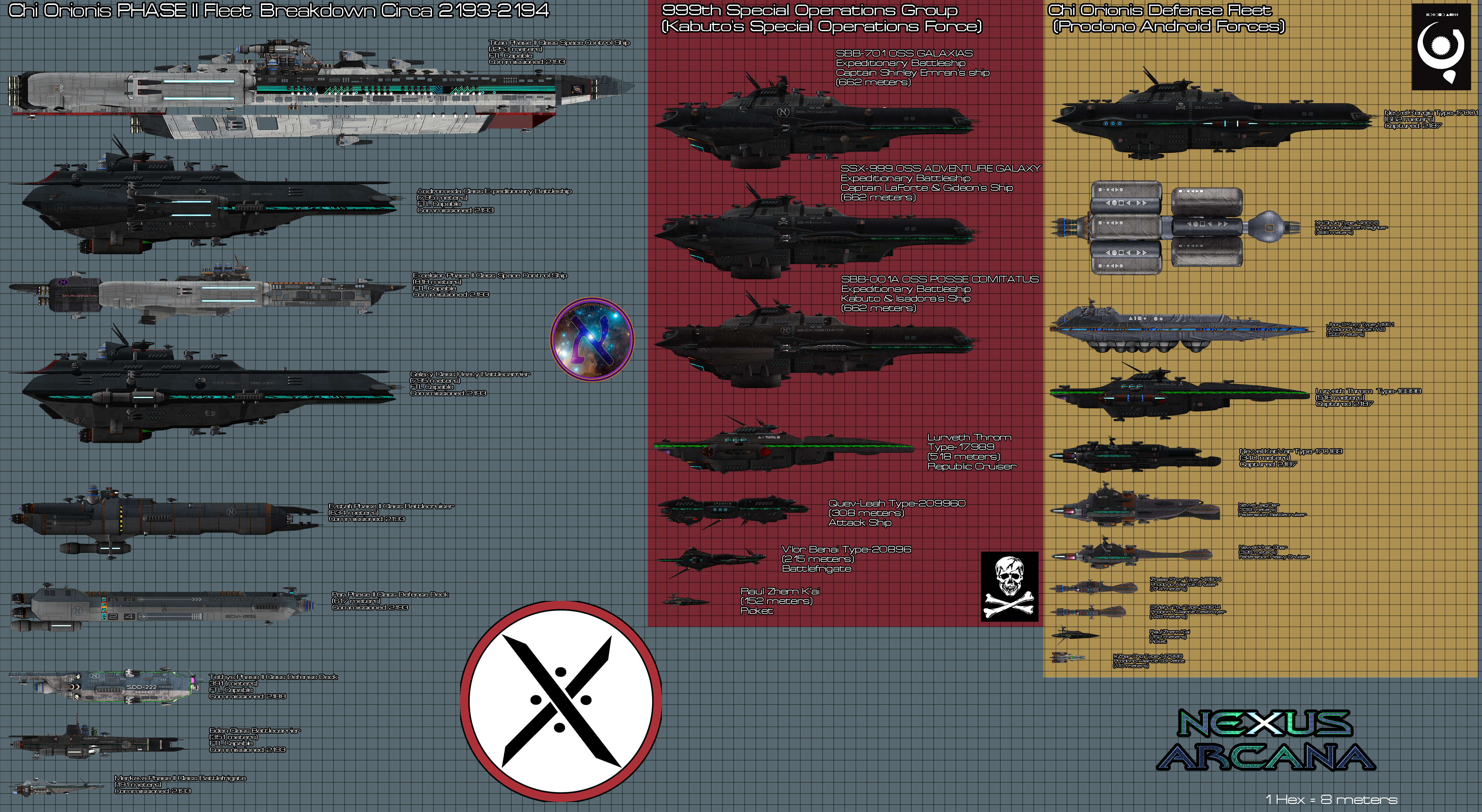 The first major extended refit was to the Titan class. The older version was simply not up to the standards of the newer Tartarian Technocracy spacecraft, nor was the older version suitable to take on the larger Prodono Imperial type ships that might have been in Donaldson's Cosmo Dragoon fleet. The Excelsior class also required considerable upgrade in order to use the new SLV drives provided by the Prodono Androids. The Androids, under the command of Lady Uma (a Class 100, sentient, Female Prodono Android) gave their battle assessment of the Orion spacecraft as the Ross 47 conflict came to its zenith. Their conclusions was that a joint Android-Orion Newel-Xergis class vessel was needed to fill in the major gaps in capability in the Orion fleets. They also advised that a similar ship be built to replace the idea for a Expeditionary Battleship that involved refit Prodono Newel-Xergis type vessels. Of particular concern to them were the Eiden, Pan, and Evstafi class ships which they viewed as utterly obsolete and in need of replacement. They suggested replacing the Pan class with a redesigned J'hor D'Kom Prodono Alliance planetary assault ship that could use K'hor Kai Type-KK17695 dropships and/or a suitable Android-Orion type dropship design. Uma and her team found that replacing the Evstafi with a Lurveth Throm redesign, and the Eiden class with a Quev-Leah inspired design. They also found that a Raul Zhem Kai type corvette would help the tactical defensive line of the Orion fleets greatly.