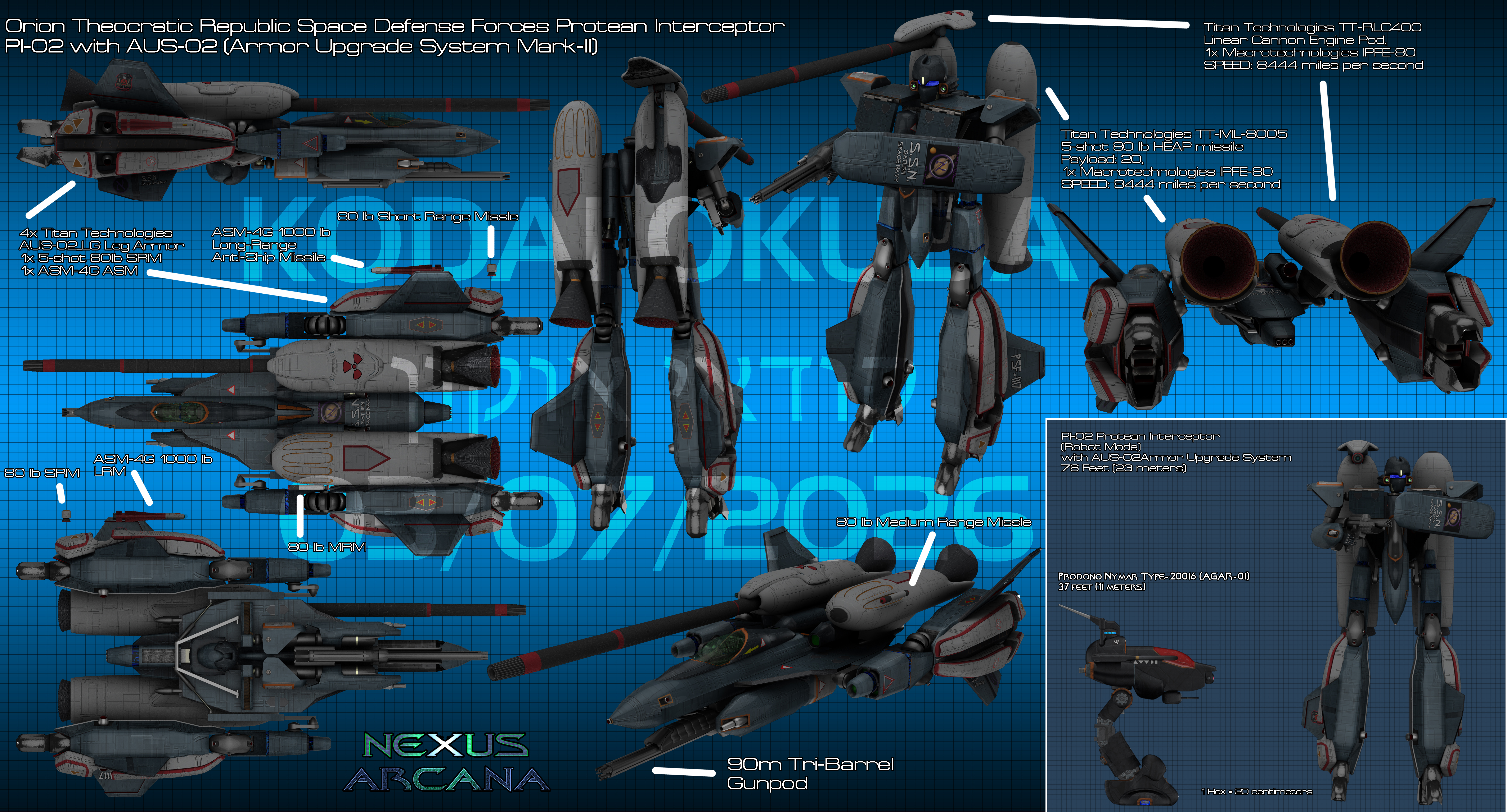 The AUS-02 extended the lifespan of the existing fleet of PI-02 Ravens by just over fifteen years while newer Protean Interceptor designs were being developed. The PI-02 was expected to remain in service until sometime around 2210 before being retired. However, the realities of the Ross 47 conflict and 2nd Interplanetary War of the early 2190s made it clear that the PI-02 needed to remain in service for as long as it could. Thus the AUS-02 was fitted with a Linear cannon, high-speed Ion Plasma Fusion Drives, and anti-ship cruise missiles. Unlike other AUS types for the other Protean mecha, the AUS-02 was geared towards being able to destroy medium to small sized spacecraft like the Raul Zhem Kai, V'lor Benai, Newel Kat'Var, and Quev-Leah warships.