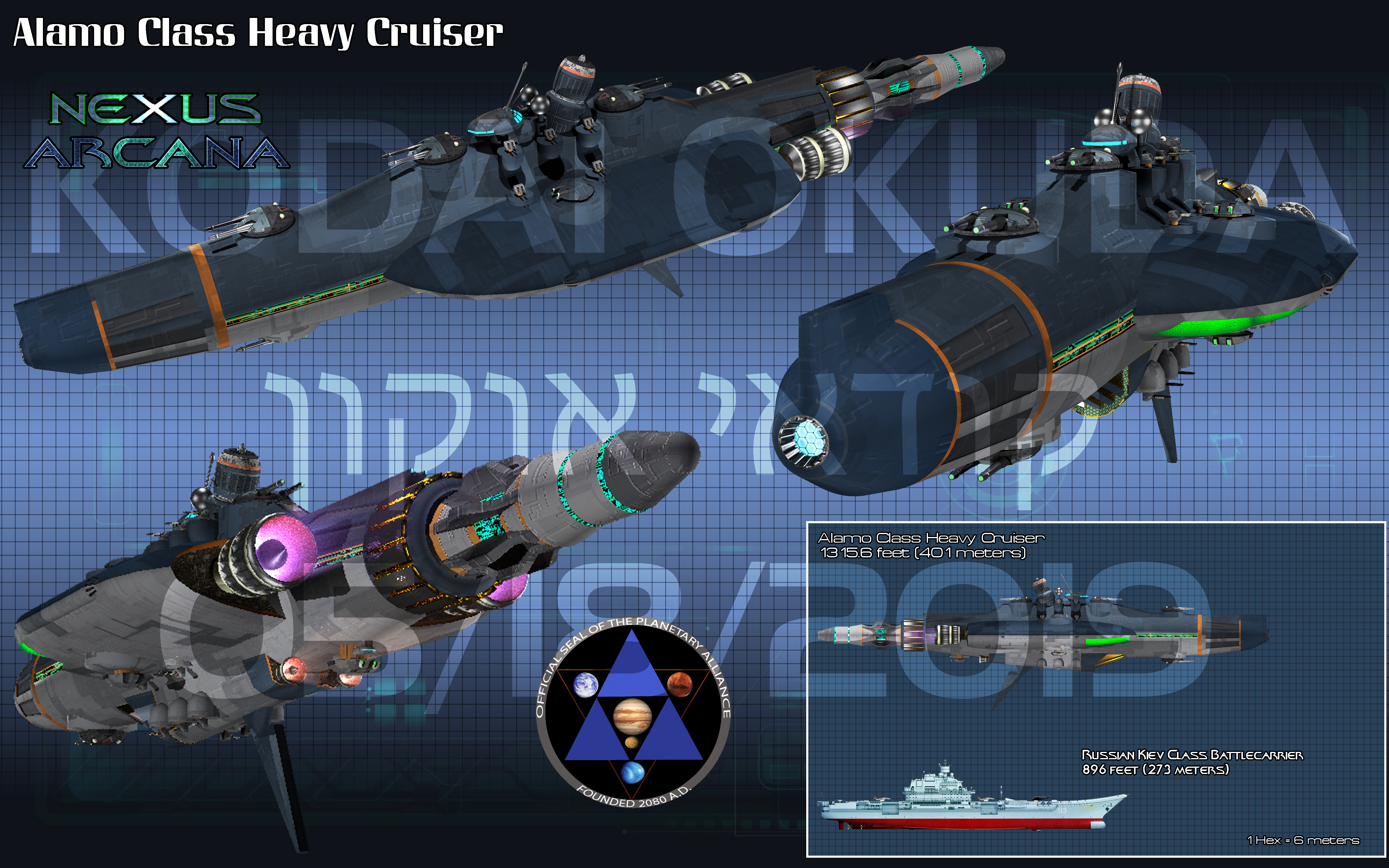 The Alamo class family of cruisers were the first in a new line of Terran designed spacecraft. This shift went from the "Space Crusier" designs that were based on ocean vessels, to a "Cosmo Cruiser " design scheme that were made for spacecraft intended to perform long distance travel within the 1000 light-year Quarantine Zone around Sol. While the "Space Cruiser" type of craft were for meant for interplanetary operations and were adapted to interstellar missions, the "Cosmo Cruiser" concept was meant for interstellar tasks. This new "Cosmo Cruiser" type of spacecraft had to have a minimum time-dilation of 1.00 light-years per hour. This minimum shut out many of the older designs, and caused a need for refit of existing spacecraft and the design and construction of newer vessels. The Alamo class met all of the criteria for a "Cosmo Cruiser" and was the epitome of what the type of ship meant. The primary reason for the Alamo and other "Cosmo Cruiser" spaceships was the Ross 47 conflict that was rapily degenerating into a full blown war. The inability of the Planetary Alliance to project power to control the system or protect their Xanadu colony there forced the creation of the new type of spacecraft and the creation of classes of ships like the Alamo.