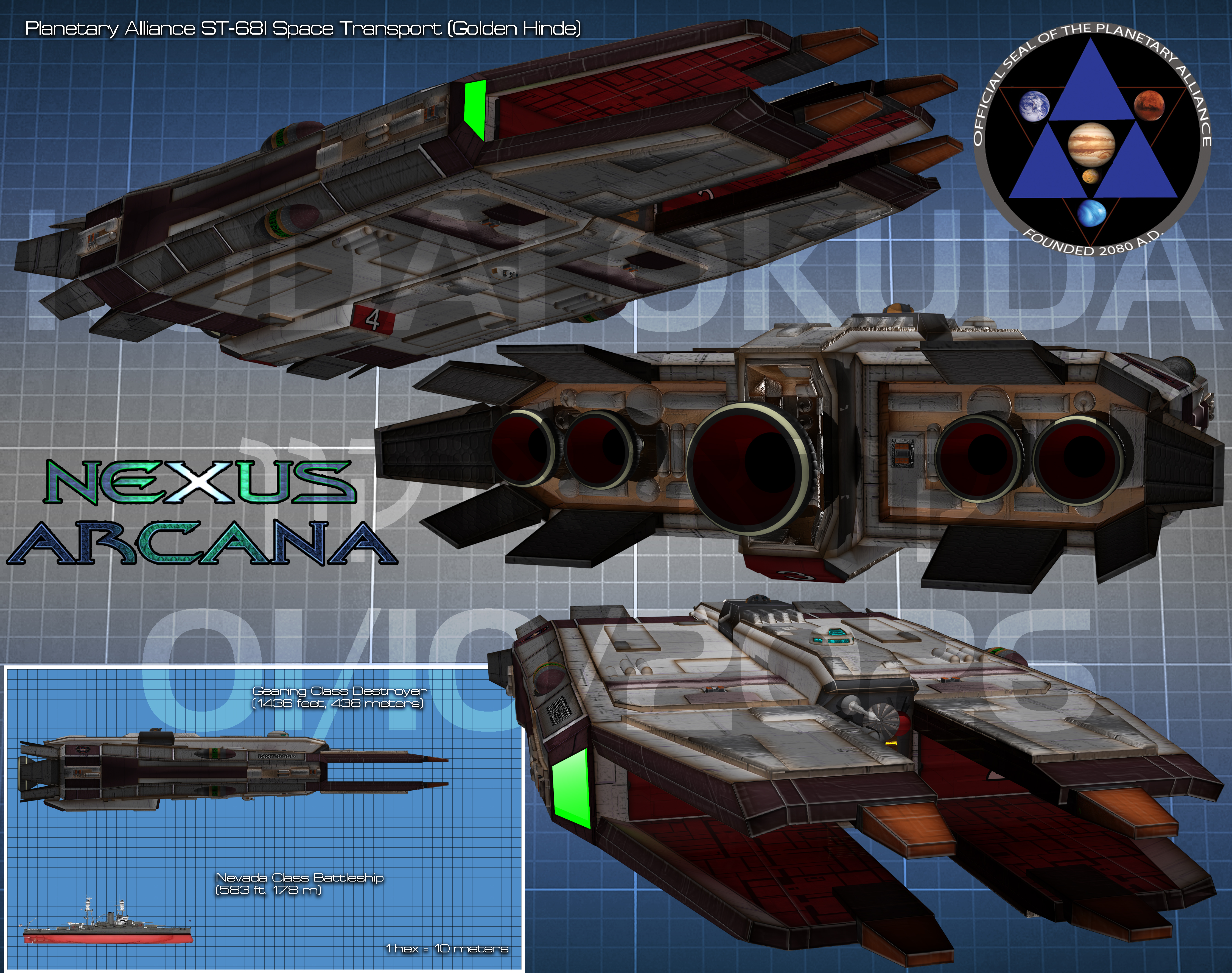 The Golden Hinde was a ST-68 class of UN shuttle-transport ship that was originally built by the United Nations Space Corps in AD 2169. It was a typical defense carrier of the old UN Solar Empire used for cargo going to and from Earth, Luna, Mars, and the various planetoid bases. The original class of ST-68 spacecraft were somewhat successful as space fighter transports and were quite agile in both space and in an atmosphere. The mission of the ST-68 series did not change much after the end of the 1st Interplanetary War, save for the types of vehicles that it carried. The "I" designator of the ST-68I class stood for "Industrial" meaning the ship was refit to accomodate for whatever industrial puropose it was being upgraded to perform.