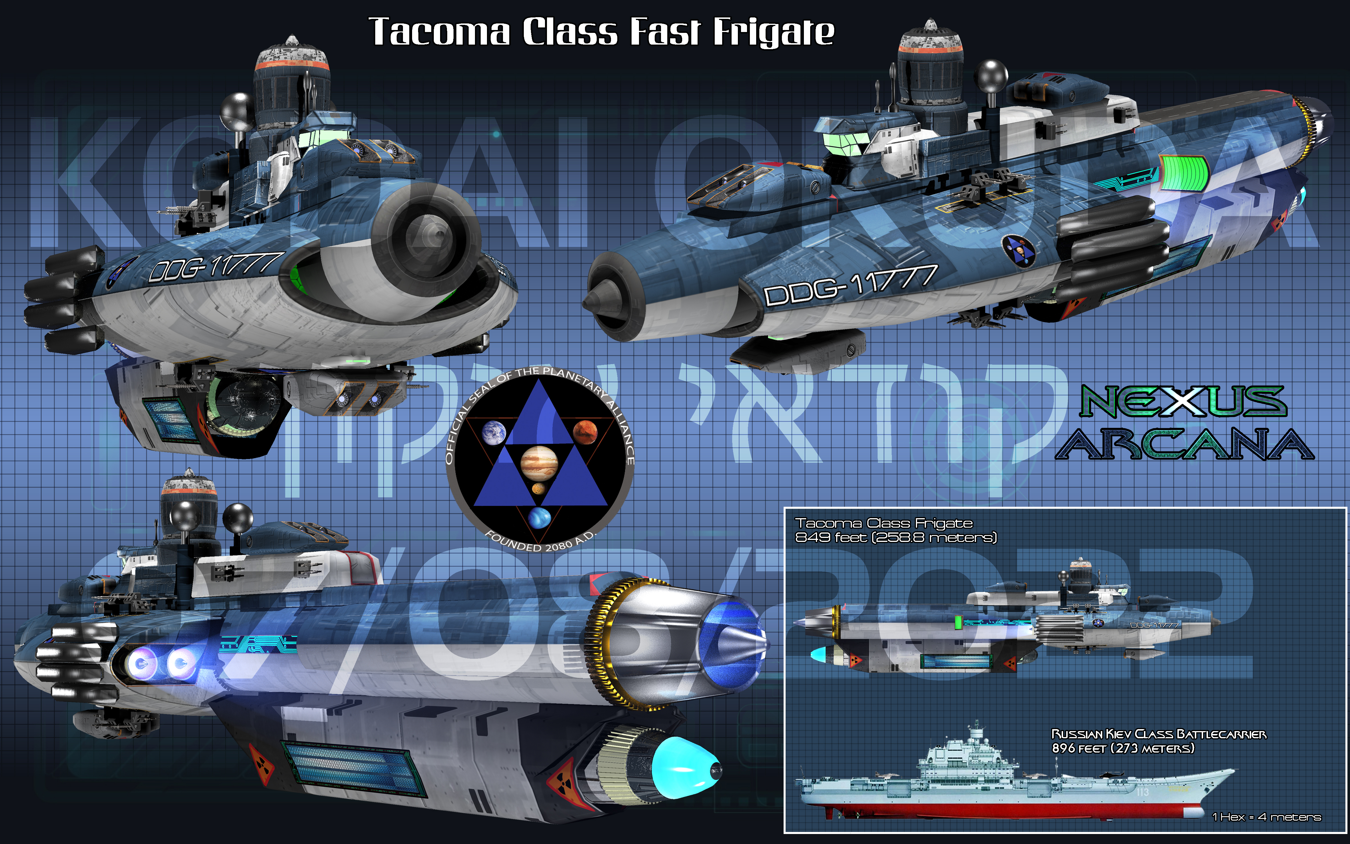 While the Potempkin class was deemed adequate by the Planetary Alliance Space Navy acquision board, the random failure of the Stellar Warp Drive system due to the Electromagnetic Drive sharing an engine housing with it was too much of a risk. Therefore, a nearly identical, albeit larger, frigate class was developed to replace the Potempkin. This new class was the Tacoma. The Tacoma class saw an increase in displacement and size which hurt the time-dilation of the spacecraft a bit, but not enough to be a hindrance. It was classified as a fast frigate due to the velocity of its sublight EMD drive which was double that of the Potempkin. This velocity was considered necessary for the missions that the Tacoma was expected to perform based on the data from the Outer Sphere War.