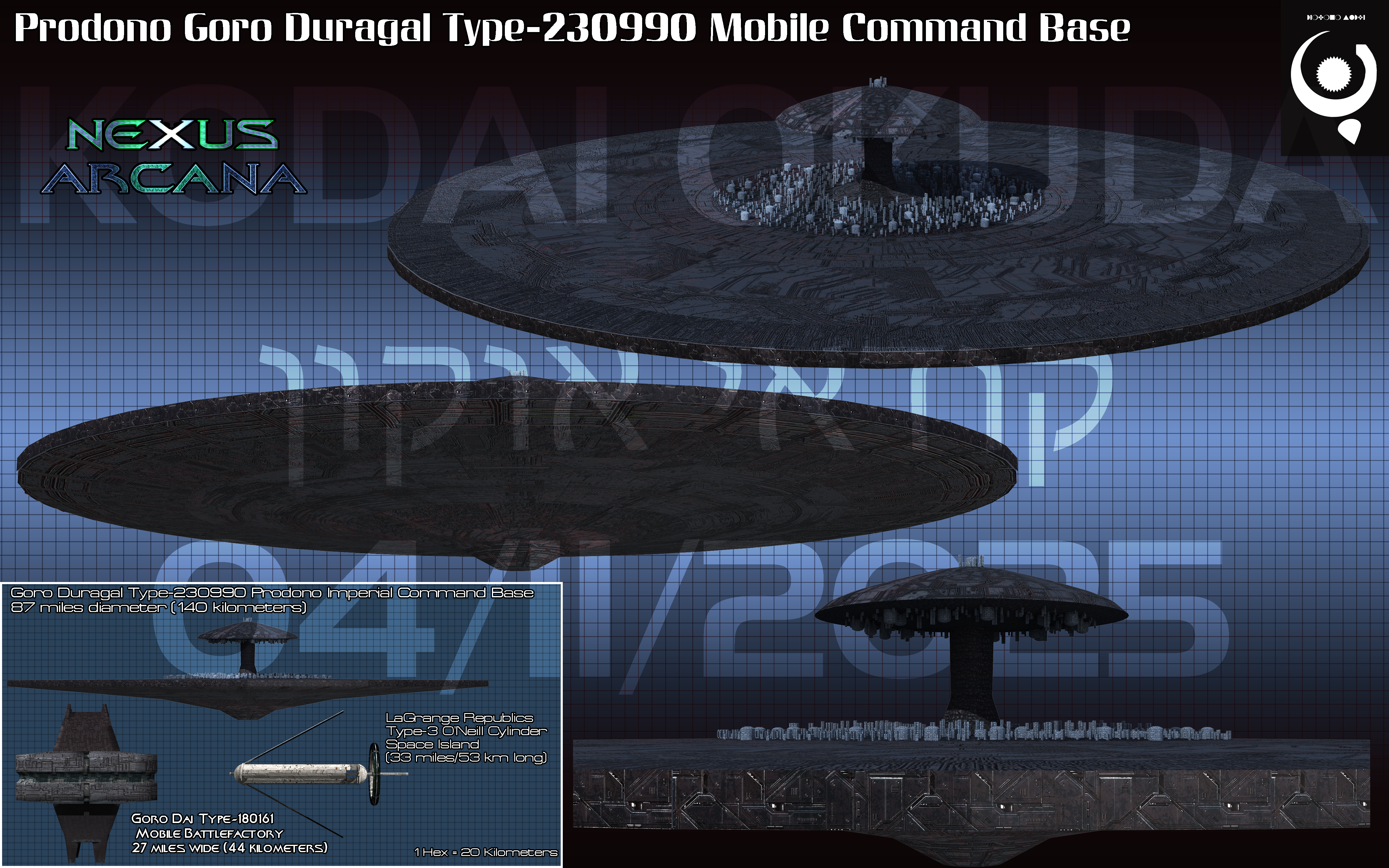 The Goro Duragal Type-230990 mobile command base was the first of the Prodono Empire's style of space station colonies after the reconsolidation of the Republic into the Empire. However, it was also the crowning achievement of the Prodono Republic as it was designed during the Republic even though it was not built. Like nearly all of their previous mobile stations, the Goro Duragal was a massive structure. The Goro Duragal was intended to allow for the projection of large-scale fleets of warships within a designated sector of space within the Milky Way and Magellanic Clouds. While the volume of spacecraft this mobile command base could construct was enormous by Earth standards, it was actually considered moderate during the late Prodono Republic and early Imperial era.