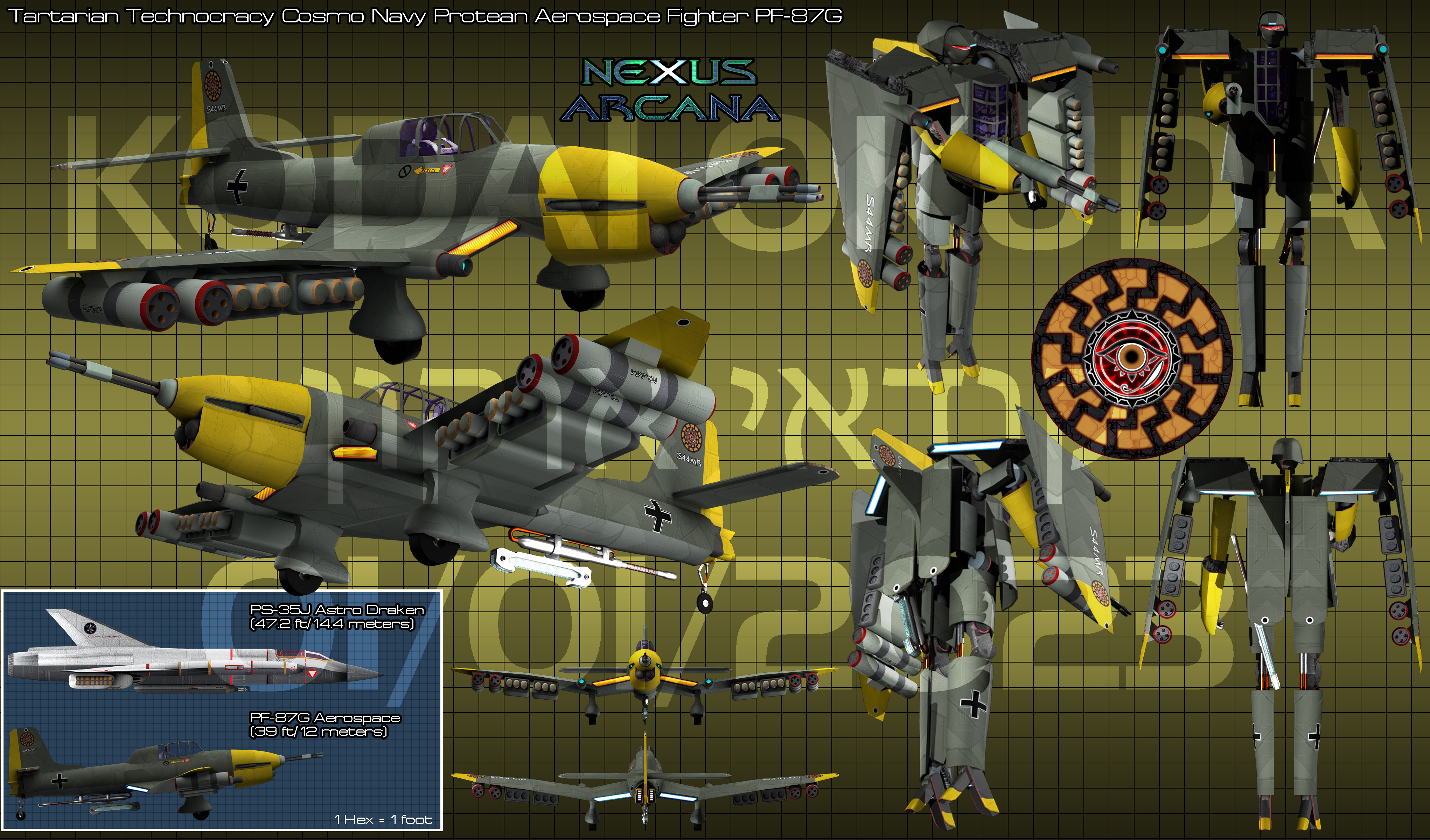 The PF-87G "Junker" Protean Aerospace Fighter was little more than a copy of the Neo-Hebrew PF-04U CosmoCorsair. The Tartarian Technocracy knew they needed a ground attack fighter for planetary assault operations. They didn't want to use a dropship, so a Protean fighter was the best solution. Unlike the CosmoCorsair, the PF-87G was not designed with interplanetary engines, instead it used only planetary and surface-to-orbit capable ion drives allowing it to land on an Earth-like planet with comparible gravity, and then escape the gravity-well to acheive orbit for pickup from a larger spacecraft. The weapons of the PF-87G were all geared towards ground assault and were not very useful for space combat. As a result, these Protean Fighters only saw action on the Moon of Good Hope where they were badly outclassed by the PS-01-AUS-01 Armored Protean Fighters of the Neo-Hebrews. The Tartarian Technocracy used the PF-87G during the Ross 47 conflict and 2nd Interplanetary War despite its short comings.