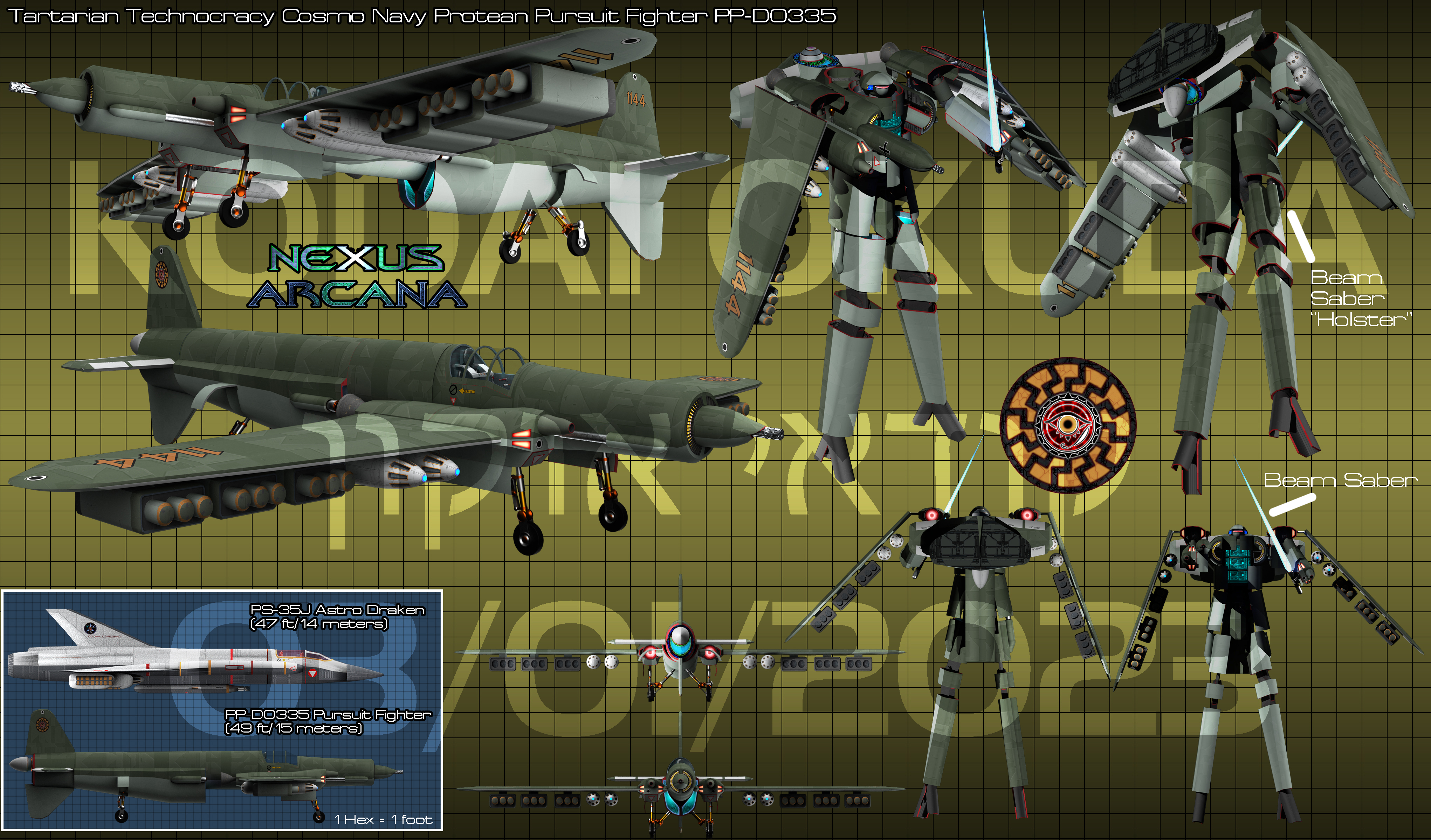The culmination of everything learned from the previous Protean Fighters was incorporated into the first Protean Pursuit fighter. The fighter designation indicated a Protean mecha fitted with a faster than light drive giving it the ability to pursue an enemy that had attempted escape via hyperspace. The Tartarian Protean mecha engineers at Tyche had samples of all four of the Protean mecha built by the Neo-Hebrews of Saturn by AD 2178 and had fashioned the PP-DO335 from all of this data. They wanted a fighter capable of performing planetary assault missions like the PF-04U CosmoCorsair, general purpose space superiority like the PS-01 Archangel, interceptor capabilities like the PI-02 Raven, and heavy bombardment like the PA-03 Shinden. The PP-DO335 did in fact peform all of those missions adequately, albeit not quite as good as each of the Neo-Hebrew mecha. The Tartarians however wanted a single machine that could peform all of those tasks due to their limited resources and manufacturing capabilities in 2179. The PP-DO335 was a VERY successful Protean mecha and was used to great effect both in the Ross 47 conflict and the 2nd Interplanetary War. It was used for many years after the 2nd Interplanetary War into the 23rd Century.