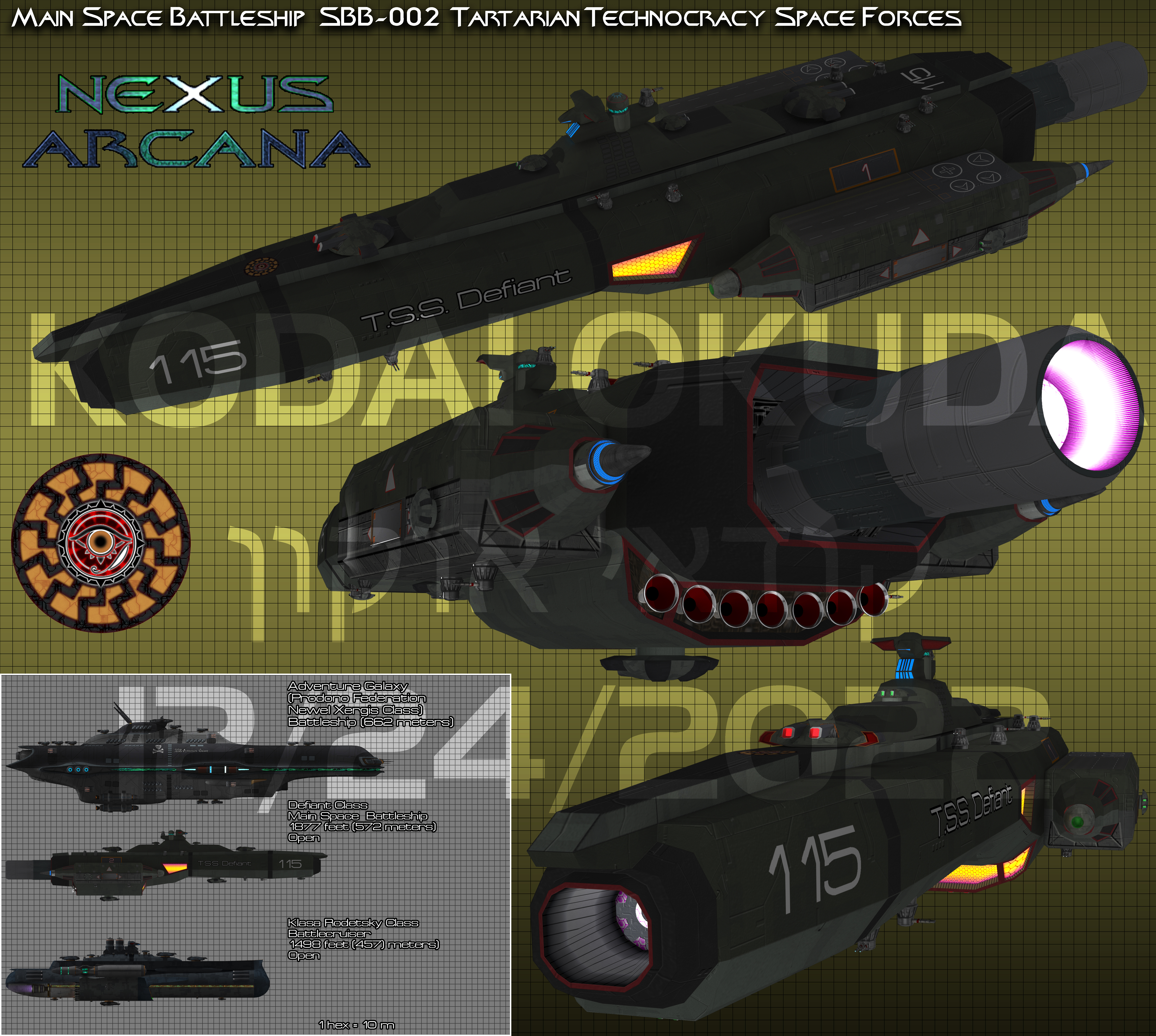 The Defiant class of Main Space Battleship was the first vessel designed and built entirely by the Tartarian Technocracy. It was the first line of spacecraft to come out of their orbital shipyards in the Epsilon Indi star system. These ships were not meant to replace the Revenge class of main space battleship, but rather were meant for the Alien Repulsor Fleet (APF). The APF concept was abandoned after the Tartarian Technocracy leader, Sovereign Grand Inspector General Khazar Rothschild, learned of Doctor Donaldson's Cosmo Dragoons gaining control of a massive Prodono base, and restoring its fleet. Instead, the Defiant became the main Capital ship of the Offense Space Navy forces that were being built to take on the Neo-Hebrews of Orion, Planetary Alliance, and Union of Sovereign Solar Republics. While most of the weaponry of the vessel were standard for its time, it was the maw gun of the ship that made it unique. It was the first Terran built wide-angle beam weapon. The main reason for the wide beam was to destroy incoming enemy mecha, or missiles. The second useage was to deplete the defensive shields of enemy craft in order to weaken them enough for other weaponry to penetrate more easily. The wide-angle beams did have a major drawback, that being that the damage inflicted was considerably less due to the thinning out of the particles of the beam and it spread out. A restrictor was added to the maw gun in 2192 that allowed the weapon to be recalibrated to fire a tight beam (like a normal EMPAC beam gun) at a single target. However, the recalibration required a few minutes to do, and during combat that was a crucial deficiency.