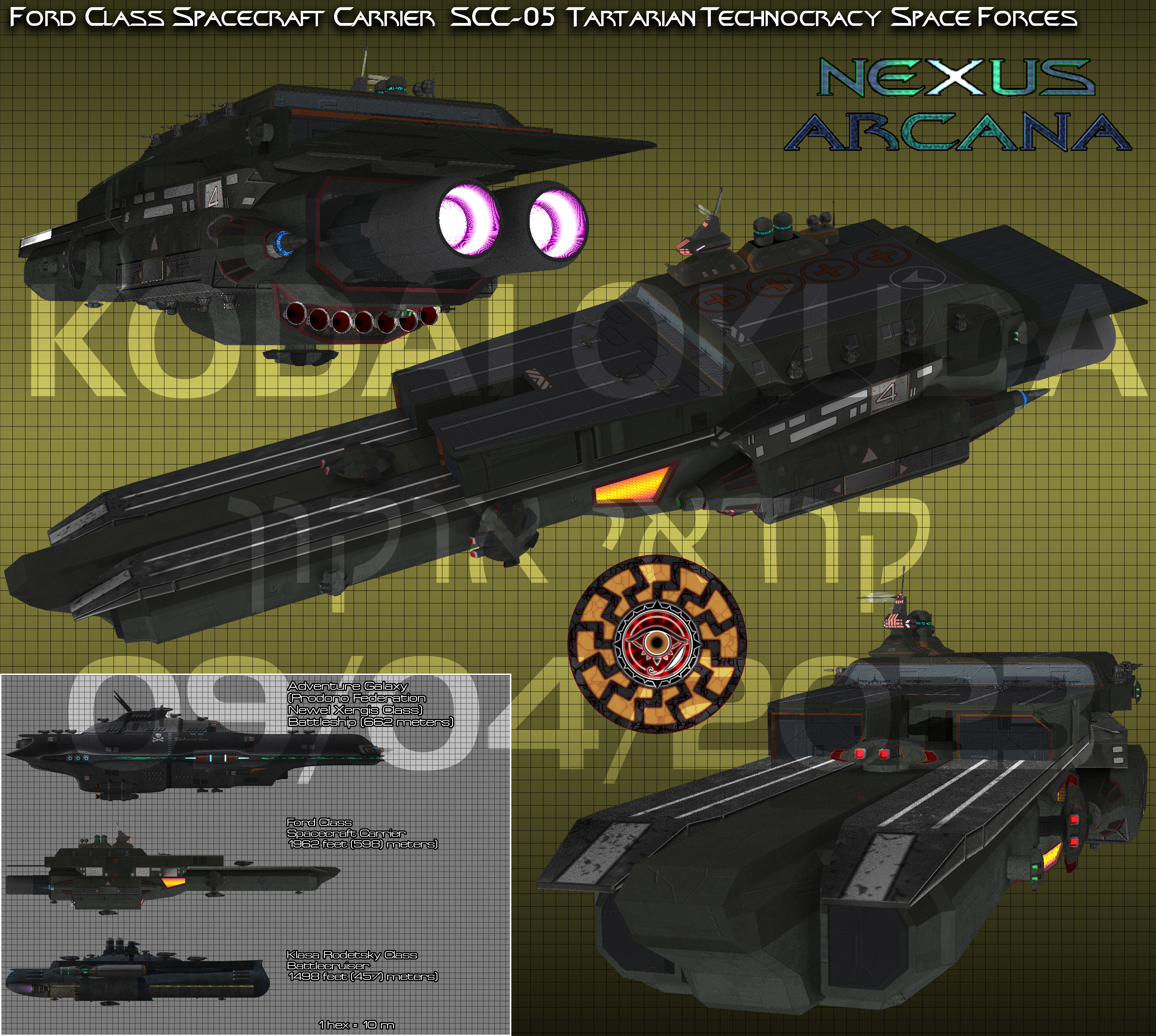 The Outer Sphere War saw a wide range of warship designs tested to their fulliest against the Prodono Android forces. One of the biggest failures of the war were the Shinano class of Planetary Assault Ships. The exposed hangar deck, flimsy pylon supports, and exposed warp nacelles my have been fine for the 1st Interplanetary War and Ceres Conflict because the shields and armor were strong enough to withstand most attacks, but the Outer Sphere War saw the effective use of Prodono-style weaponry, tactics, and mecha. The illumination of the main hangar deck, used by the deck crews to see comfortably instead of relying on sensors or infrared, made a tempting target for attacking mecha and enemy warships. These shortcomings prompted the LaGrange design teams to create a new version of the spacecraft carrier that was less conspicuous and better protected. The main hangar deck was enclosed, the two main EMPAC maw guns (rarely used on the Shinano class) were removed in favor of greater internal volume for the housing of the warp drive engines, and for more mecha. The result was the Ford class of spacecraft carrier.