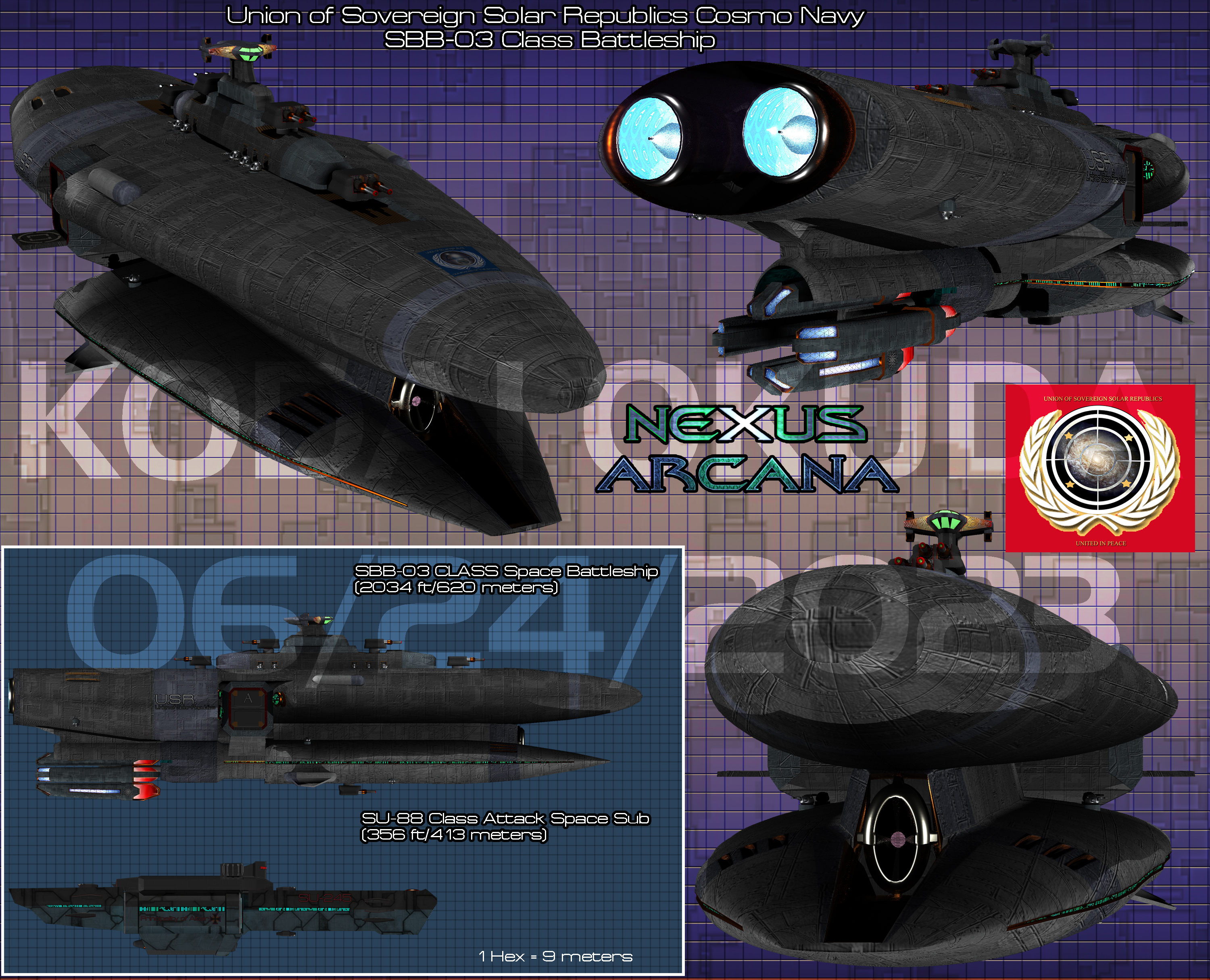 The SBB-01 space battleship was superb for the last few years of the 1st Interplanetary War in terms of firepower, faster than light speed and shielding. During the Ceres Conflict the ship was adequate in the limited skirmishes the class found itself in. The Outer Sphere War however exposed the shortcomings of the SBB-01 class of space battleship and showed the need for upragde. Hence in 2188 the SBB-02 space battleship's upgrade was expedited in order to get the capital ships up to speed with the needs of the post-Outer Sphere War era. Like all of the vessels in he 2188 upgrade program, the ships were refit quickly, thus only the essentially systems were changed. In the case of the SBB-01, her old PHELAC turrets were changed to MESON cannons in order to defeat Prodono energy resistant armor. The short range space torpedoes were changed out with long range nuclear tipped types, and the deflector shields were changed to more advanced types. The single Stellar Warp Drive engine was replaced by a quartet of SWDs that were standard on the Omni-Hull ships, this increased the time dilation of the vessel considerably, bringing it up to 2188 standards.