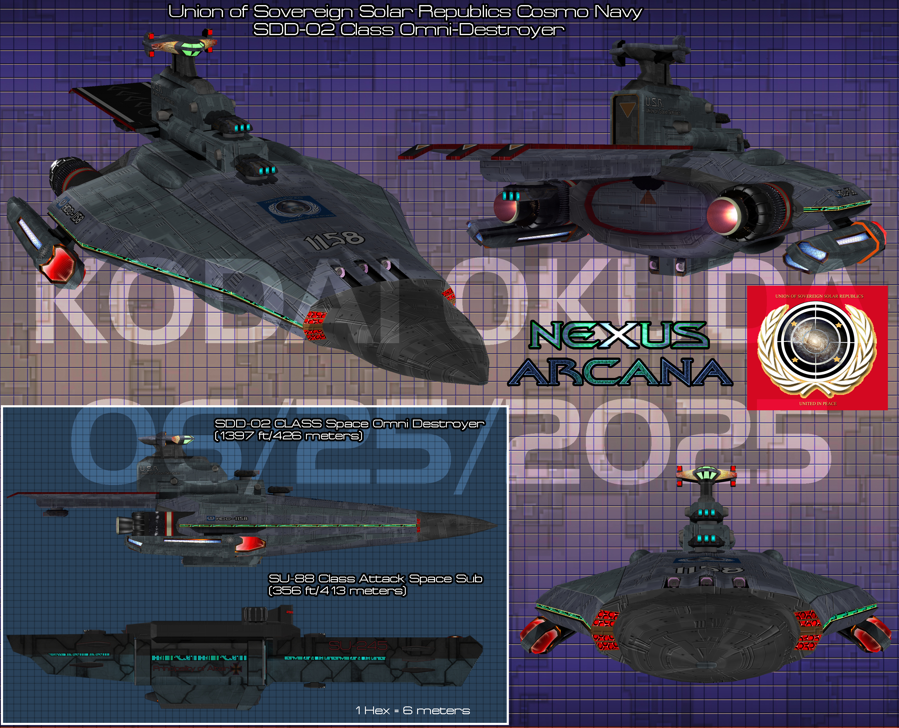 The SSD-01 heavy space destroyer was the workhorse of the USR space navy and while it proved very effective in the Ceres Conflict of the 2180s, the Outer Sphere War exposed the shortcomings of the ship's shields, weapons and faster than light drive systems. Thus, starting in 2187, an upgrade/refit program was put into motion at Alkaid in order to upgrade the entirety of the SDD-01 fleet to the new SDD-02. Both craft were nearly identical save for the improved Stellar War Drives, triple-barrel EMPAC turrets, improved space torpedoes, and improved deflector shield generators.