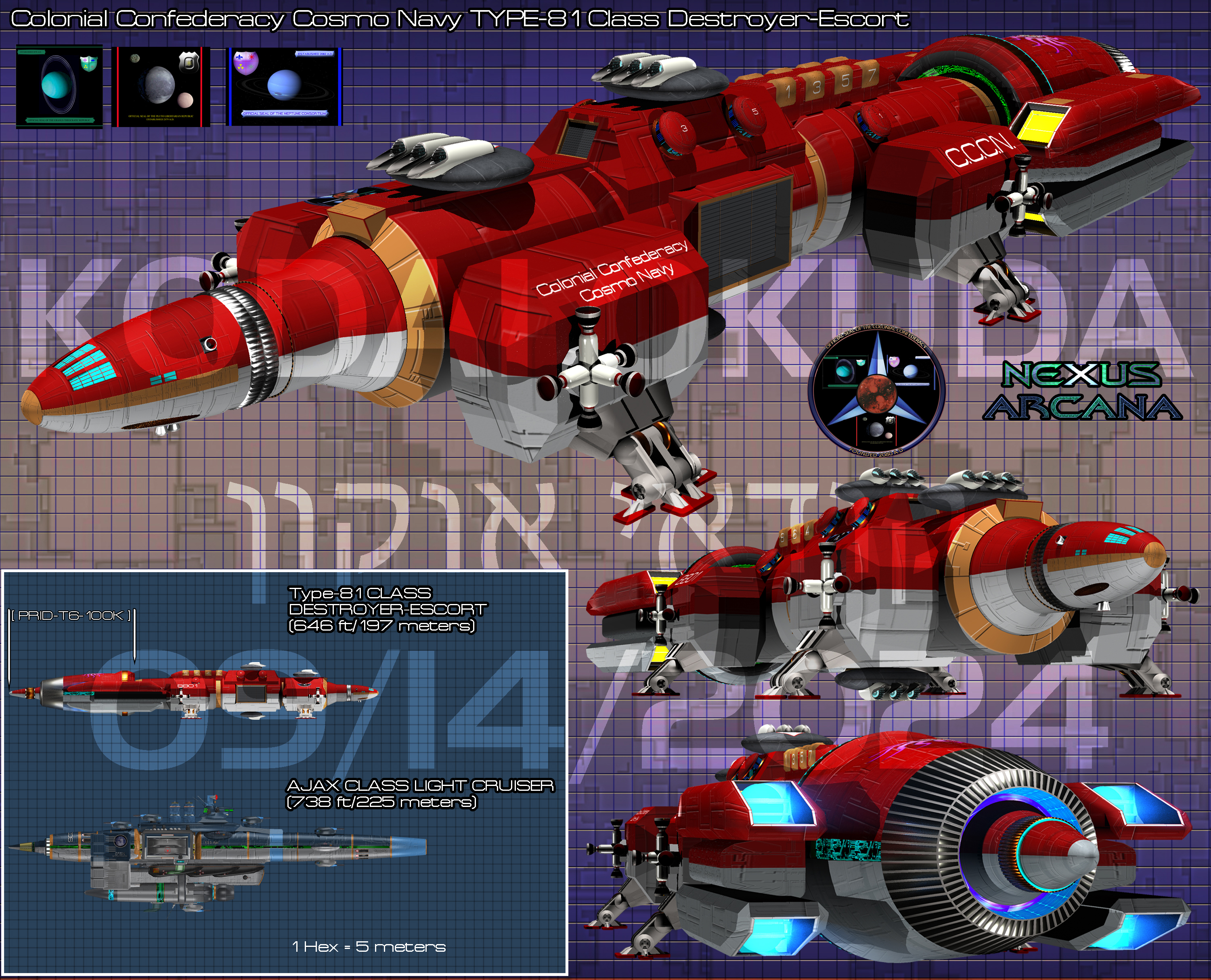 The Jovian Defense Force Narvi class refit of the old Solar Empire Conqueror class destroyer was an exceptionally successful missile-destroyer design of the late 1st Interplanetary War and post-war period. The problem was however, that the Narvi used a Type-2 Intersection Drive unit, and PHELAC beam weapons. These were viewed as being wholly inadequate in the mind of Edric VonStalin, the commander of the Pluto Republic's armed forces. He wanted a vessel that could make use of the existing fleet of Narvi and Conqueror vessels in their space navy, and so a refit project for the Narvi types of vessels was initiated in 2180. By late 2181, a refit, the Type-81DE destroyer escort, was approved for mass upgrade of their existing fleet and construction of new vessels of the Type-81DE model.