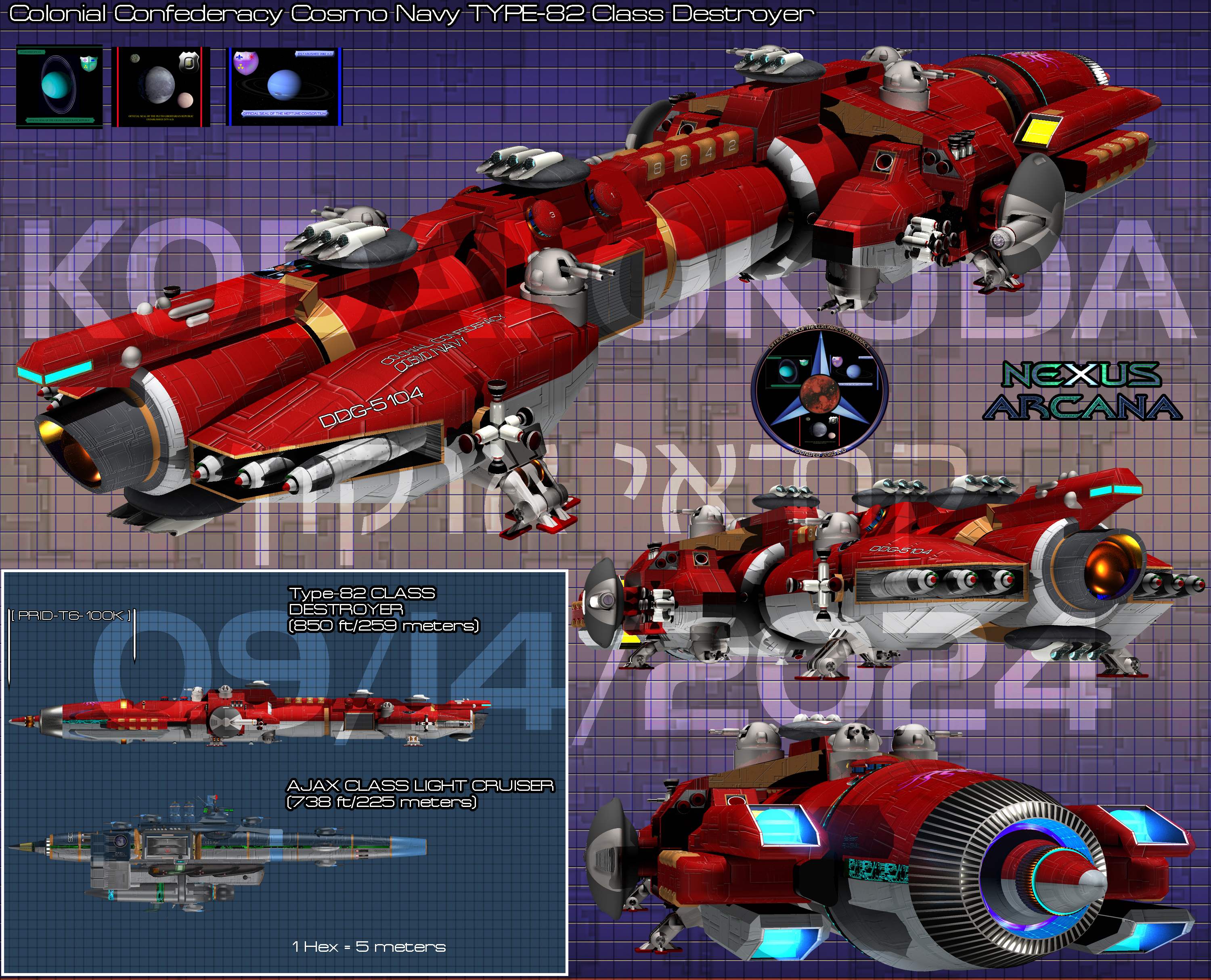 The Sentinel class was originally part of the emergency rearmament program of the Jovian Defense Forces started in 2178 and completed in 2181, however, the design never fit into the war strategy of Supreme Commander Edric VonStalin of the Pluto Republic. It was his design tems of the former United Nations Solar Empire that had designed and produced the Harpy class of heavy cruisers that the Sentinel class ships were derived from. While the Sentinel class was adequate to fill the needs of the Colonization fleets being sent out into the Local Group of Stars around Sol, they were not up to the standards that VonStalin required for his future plans regarding the Union of Solar Republics and Principality of Altair. The warp speed, weapons, and defenses of the Sentinel class were too weak and underclassed for his liking. Therefore in 2180 he commissioned a design group to redesign the Sentinel class into a vessel more suitable to his needs. The Type-81DD destroyer was the result. The main emphasis VanStalin wanted was removal of the six Lithgear LG-PC-300 PHELAC beam barbettes at the bow of the Sentinel with six ASM-10K anti-ship cruise missiles. He wanted true capital ship destroyer as the main fighting spacecraft of his fleets. The refit of his also allowed all of the existing Harpy class ships in the ex-Solar Empire fleet Pluto and the other Colonial Confederacy nations had to be quickly refit to the newer Type-81DD. With upgraded warp drives, deflector shield generators, and greatly improved weaponry, the Type-81DD was a formidable ship for its size. It served with distinction in the Ceres Conflict and Outer Sphere War, but was showing its age by the end of that conflict. In early 2190, VonStalin ordered the Type-81DD fleet to be upgraded. By 2192 the upgrade program to the destroyers were in full swing with more advanced weapons, shields, and warp drive.