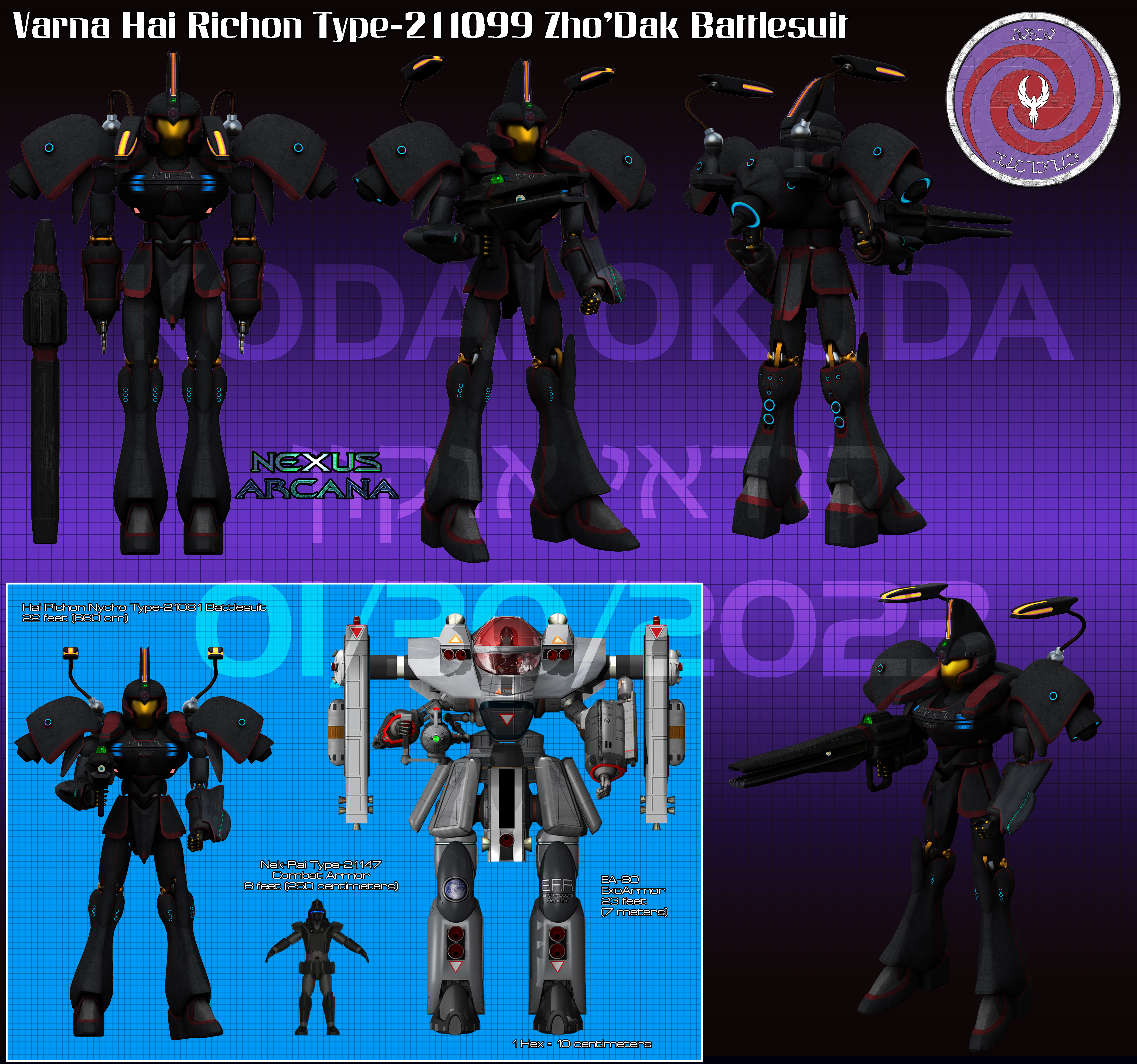 The success of the various Prodono Hai-Richon type Battlesuits was not lost on the over seventy Varna stellar nations scattered throughout the Milky Way galaxy and Magellanic Clouds. Additionally, with the total collapse of the Varna Empire around 350,000 BC (Earth Relative), the aging mecha of the armies of these stellar nations were increasingly difficult to maintain. As nearly all of the Varna states had slipped from the technological heights of the Empire, many of their ancient walkers, hover tanks, and other mechanized weapons were no longer repairable. Therefore, the Varna, ever practical, chose to outfit their armies with a machine that could be repaired, and maintained using the parts from the new dominant power in the galaxy, the Prodono. Thus, the Varna Hai Richon Type-211099 Zho'Dak was born.