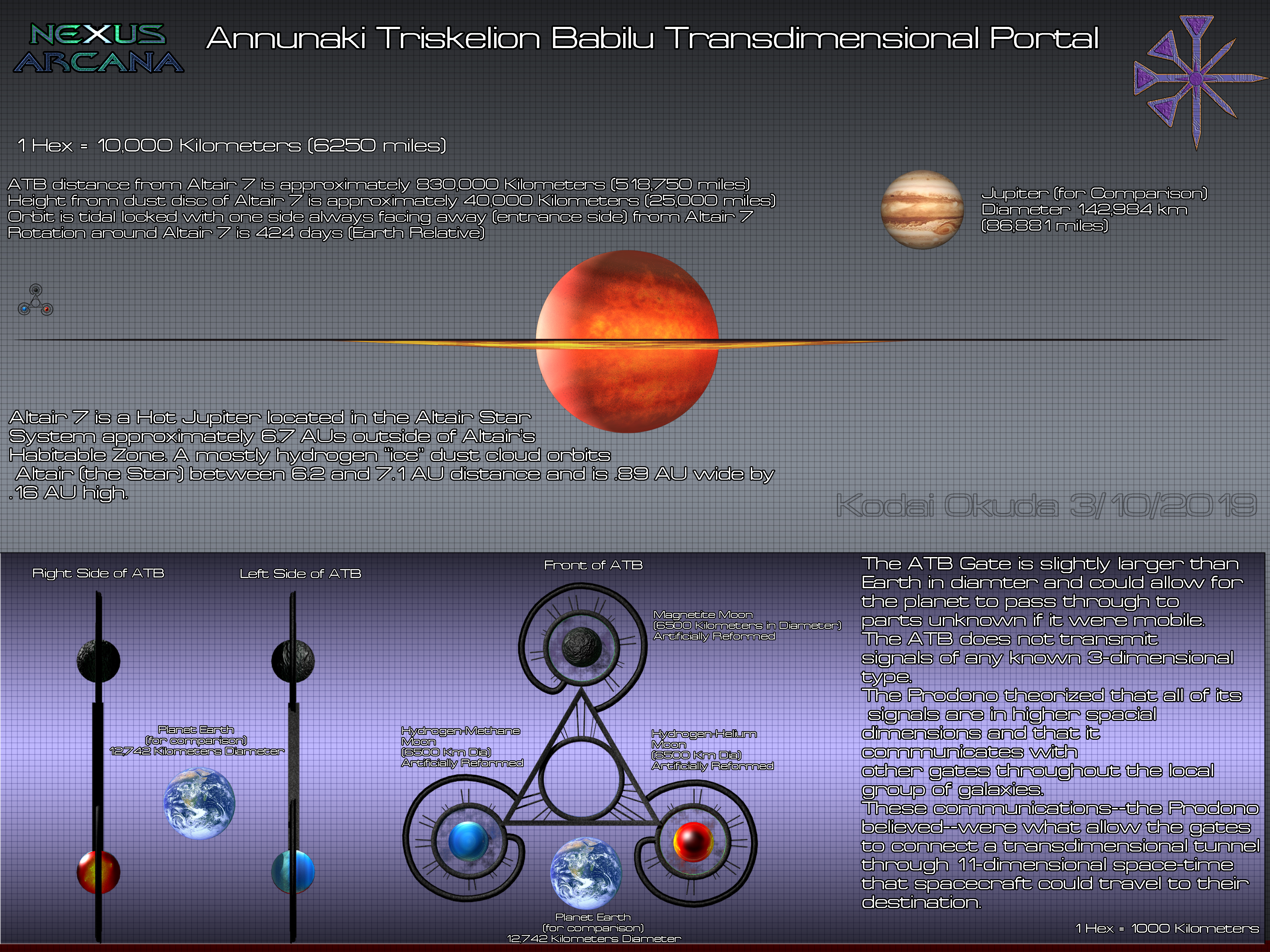 Estimated to have been built over 36,000,000 Earth Years ago by the ancient race dubbed the Annunaki by reseachers, the Annunaki Triskelion Babilu (ATB) is one of the alien wonders of the local group of stars around Sol (all stars within 100-light years). Located in the Altair star system some 16.7 lights years from Sol, around the Hot Jupiter Altair-7, the ATB is not a star gate in the traditional sense of the idea (an Einstein–Rosen Bridge), but rather a trans-dimensional gateway into 11-dimensional space that allows for riding the "cosmic ley line highway" from one of these ATBs to another in the universe at super-dimensional time dilations (estimated to be 10,000 light years per hour time dilation). These structures appear to use Dymaxion-like architecture first proposed by Buckminster Fuller combined with both the Fibonacci Sequence and "divine" geometric concepts, to scale up the gravitic distortion of a nearby large stellar body (in the case of the Altair-7 ATB, a Hot Jupiter pre-star and three of its moons: 1 moon in each of the "arms" of the Triskelion) and allow for entrance into a stable tunnel through 11D space. The method of operating this device is completely unknown and only by using the Prodono data on the ATB from a nearly Goro Dei class battlefactory was it discovered that this ATB is connected to many others, some of which are in the Magellanic Clouds and even the Andromeda galaxy. The Prodono information found at the abandoned Goro Dei class battlefactory in Altair (the second one found near the Sol star system the first being in Alpha Centauri) was inconclusive and gave only cursory data on the object.