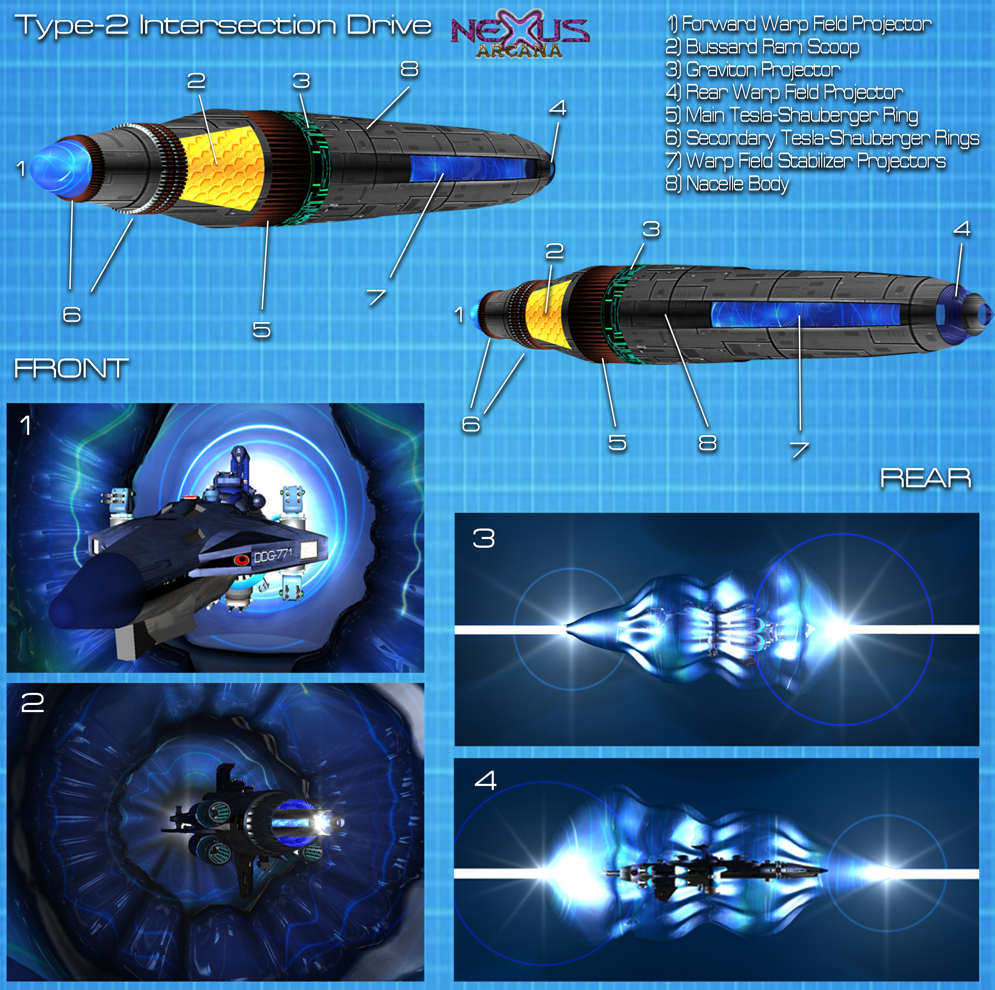 1) A forward view of the Juno-Mark-II within the graviton-warp bubble generated by the drive. Note that the bubble's "skin" does not touch the ship anywhere. If it did it would destroy the vessel instantaneously. 2) Rear view of the Juno-Mark-II and its Type-2 Intersection Drive unit generating the warp bubble. 3) An "outside" view of the inferior warp bubble of the Type-2 Intersection Drive and the electro-element conduit it is "riding" along through hyperspace.