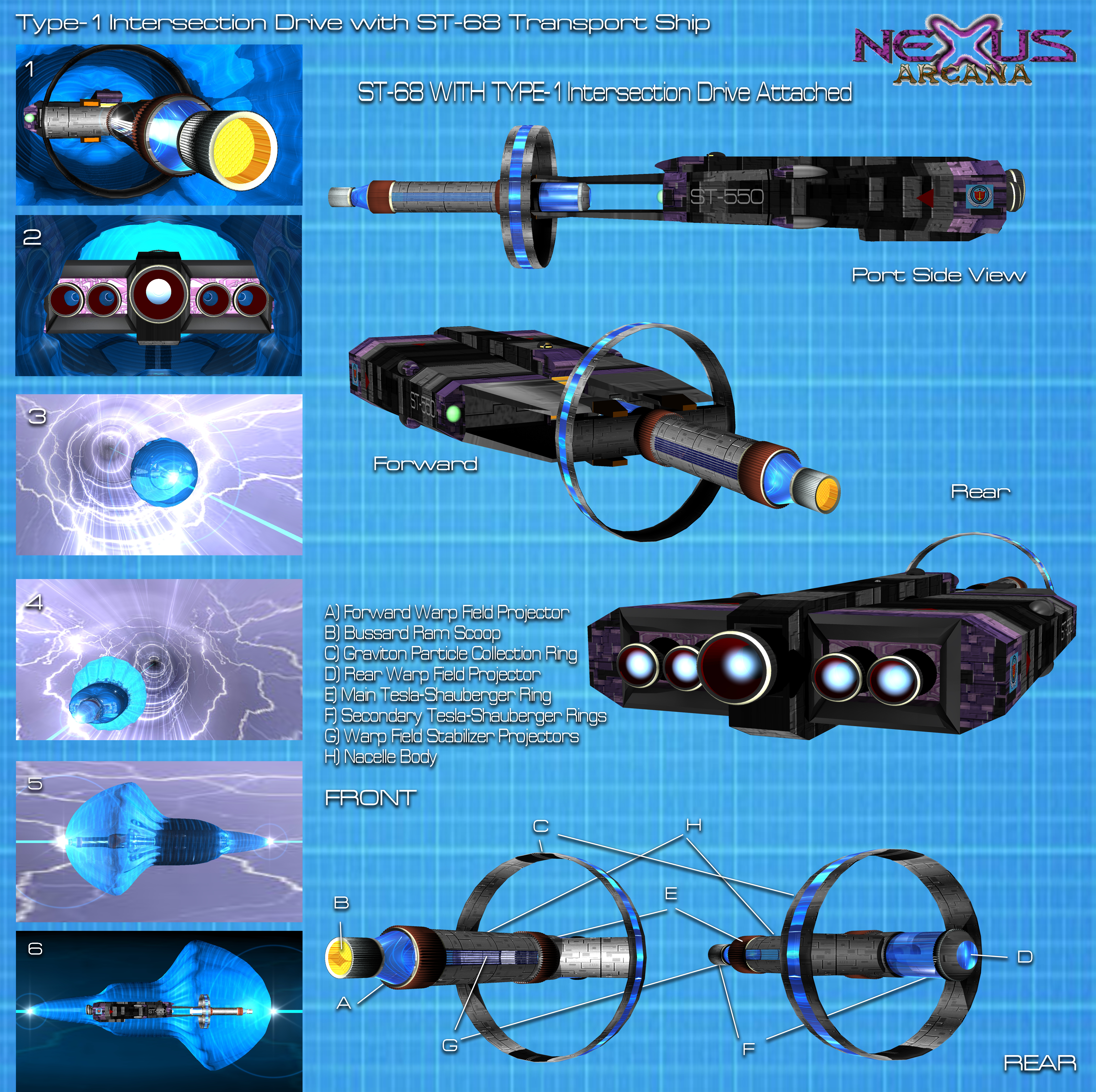 Type-1 Intersection Drive: The Type-1 drive works on the principle of punching a hole through the space-time continuum by using the intersection of natural cosmic electro-element lines of force (Dark Energy) near a planetary or stellar body of considerable size. The object must exert at least 1 g of gravity for the drive to work. The craft using the drive must follow the rotation of the planet or star within its gravity well and the ship must then accelerate around the stellar body with its rotation until the drive reaches breaking speed (maximum graviton particle collection, which is roughly a speed of 136,000 mph/218870.784 kph). The Type-1 drive does not require its own antigravity unit to be installed on the craft. Only one Type-1 engine may be mounted on a craft due to its horrible warp bubble geometry. The Type-1 was not considered safe enough for military applications, it was only useful for research and cursory exploration of nearby stars. Its warp bubble was so unstable that the gravition collection ring had to double as a warp field extender/stabilization booster to keep the bubble from collapsing onto the ST-68 test ship. The radiation from the drive did not damage the hull of spacecraft of the 2160s, but the discharge from coming out of warp was not directed away from the ship and thus any attempt to mount the engine internally was considered too dangerous/lethal. The original production run of Type-1s were all over 15,000 tons and nearly the size of an Anapolis class cruiser. While perfect for the UNSC transport ship (150,000 ton spacecraft) due to the electromagnetic grappling clamps on the vessel (which was normally used to hold UN shuttles and ferry the older UN nuclear engine craft throughout the solar system at high speed via the ST-68's high-yield-ion-engines), the Type-1 was impractical on any other spacecraft. What is significant about the Type-1 is that the first ST-68 to use it to go to Alpha Centauri, was the one that found the Prodono ship depot in orbit around one of that star system's inner planets. The time-dilation ("speed") of the TYpe-1 was a miserable 0.06 light years per hour, meaning that a trip to Alpha Centauri one way took 72.8 hours. While fast by the standards of the early and mid 21st Century, it was a crawl compared to the Type-2 drive which took half that time.