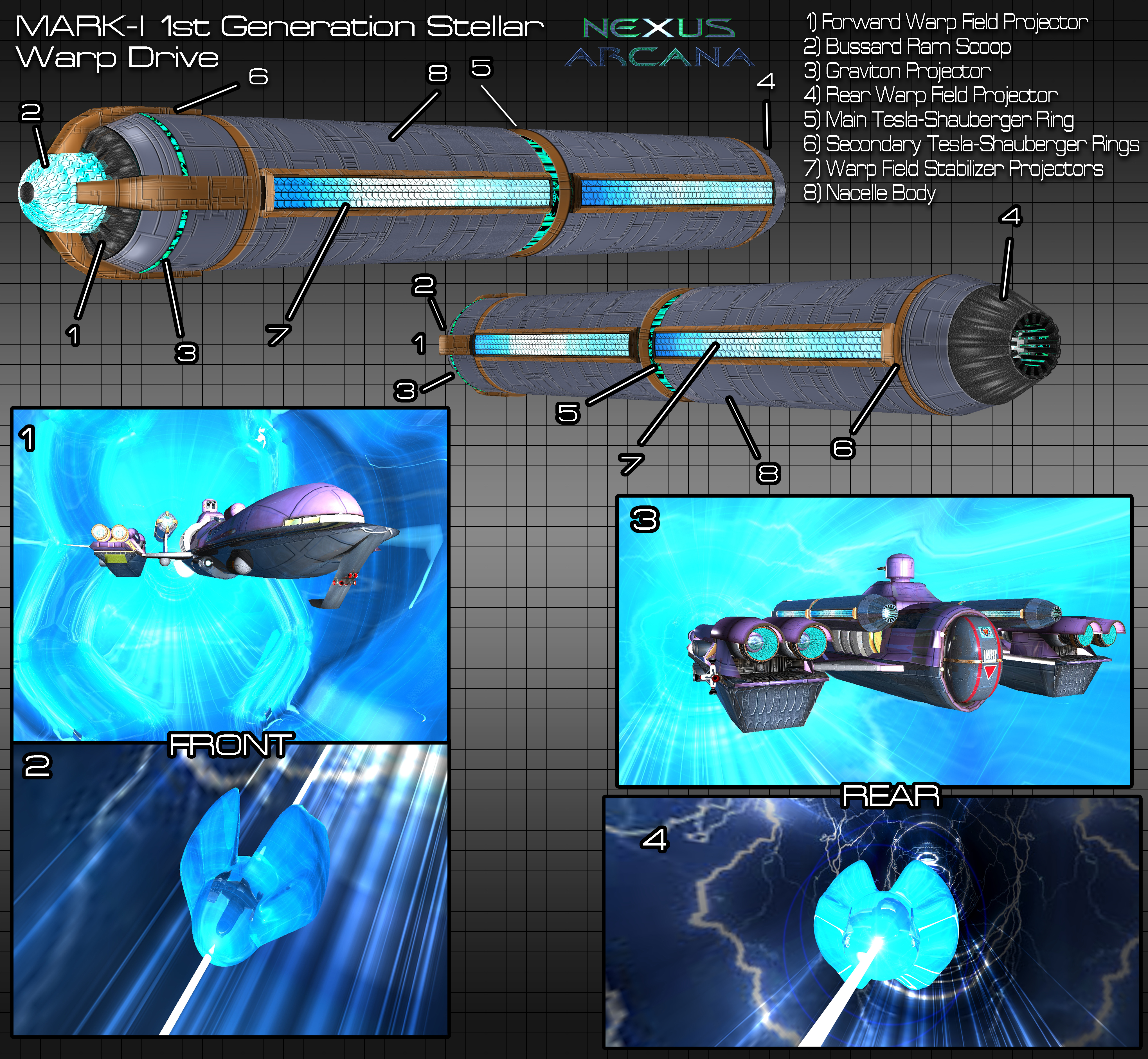 1st Generation Stellar Warp Drive: The first generation of Terran built stellar warp drive engine is able to generate its own gravity well by using the antigravity system of the vessel it is installed on as a graviton projector. The MARK-I SWD creates a warp bubble around the spacecraft which pulls and pushes the ship along the cosmic electro-element lines of force at FTL velocity. The MARK-I drive is considerably slower than the Type-1 Intersection Drive unit. However, the 1st Generation of SWDs were capable of being used in configurations of one, two, three, or even four nacelles. This allowed the time-dilation speed of the drive to increase. In the case of the MARK-I, the time-dilation was .038 light years per hour per warp nacelle. Unlike the Intersection Drives, the Stellar Warp Drive does not require its own antigravity unit for each drive mounted on the vessel since each nacelle is its own graviton generator. Therefore, a craft with two, three, or even four SWD nacelles still only requires one antigravity unit. Another major improvement over the Intersection Drive was the SWD's stable warp field. Ideally a drive should form an egg shaped or pear shaped warp field around a craft to allow a more stable warp bubble. The 1st Generation of Stellar Warp Drive did make a very uniform field, although, human error and lack of experience with super-dimensional energy physics caused the MARK-I drive to produce "wings" that flared out behind the ship's warp bubble. This waste of energy greatly reduced the effectiveness of the field and thus caused a slower than optimum speed to be generated.