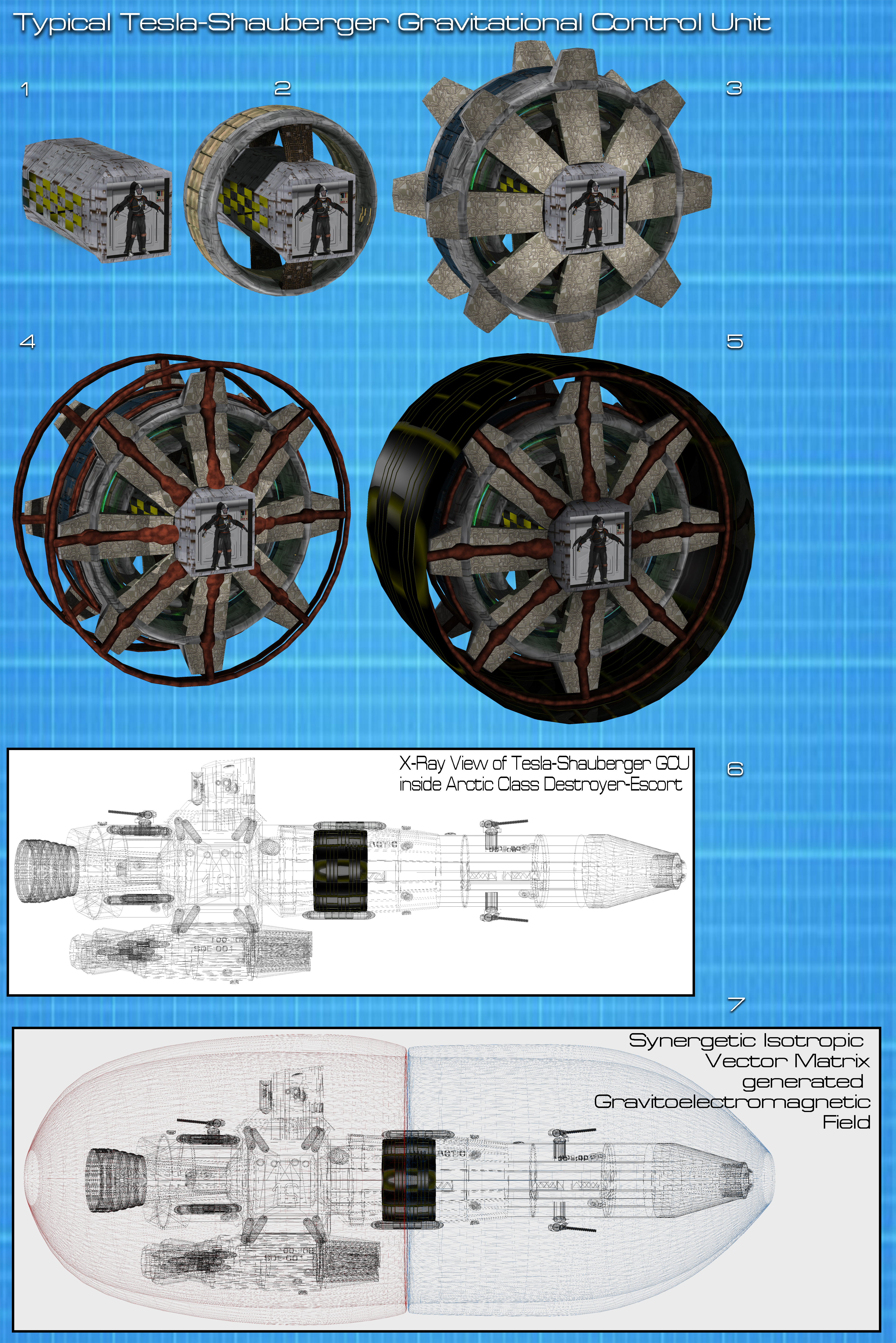 1) The control room for the GCU is located at the center of the device, and is a "null" gravity zone where no gravity exists due to the negative gravity effect of the generator. 2) The inner or positive charge ring that creates the forward facing bowl shaped "primer field". 3) The outer or negative charge ring that creates the rearward facing bowl shaped "primer field". 4) The main power conduits used to evenly distribute the emission of the Gravitoelectromagnetic field to the graviton belt on the outer hull of the ship. 5) The completed unit with the insulator shell around it to protect the hull from the ultra-high voltage generated by the GCU. 6) X-ray view showing the location of the GCU in an Earth Federal Republic Space Navy Arctic class destroyer-escort. 7) The synergetic isotropic vector matrix generated gravitoelectromagnetic field created by the Tesla-Shauberger GCU. By using an electromagnetic field, rather than electromagnetically charged metallic plates, the efficiency of the field is far greater. Note that you can see the outer field (the repulsor force) and the inner field (attractive force) as they are formed close to each other. The outer field is used much in the same way as that of the Earth's electromagnetic field in that it protects against cosmic radiation, however, the field is also strong enough to deflect micro-meteors and other small objects that could pose a threat to the ship at sublight velocities. The inner field generates the ship's internal gravity and acts as the inertia dampening system that protects the crew from being crushed at high speeds or during high-speed maneuvers. The combined fields act as a small planetary body in that they repel the ship (when tuned to the right gravitonic charge) from the surface of a planet. While this cannot propel a ship like an engine, it does allow a vessel like the Arctic class to not have to expend enormous amounts of energy trying to break away from a planet's gravity (like conventional rockets have to do with Earth). It should be noted that the mass of the ship does play a role in effecting the generation of these fields. As illustrated here, the fields are not centered on the GCU, they are slightly to the rear due to the fact that the majority of the Arctic class ship's mass is to the rear of the generator.